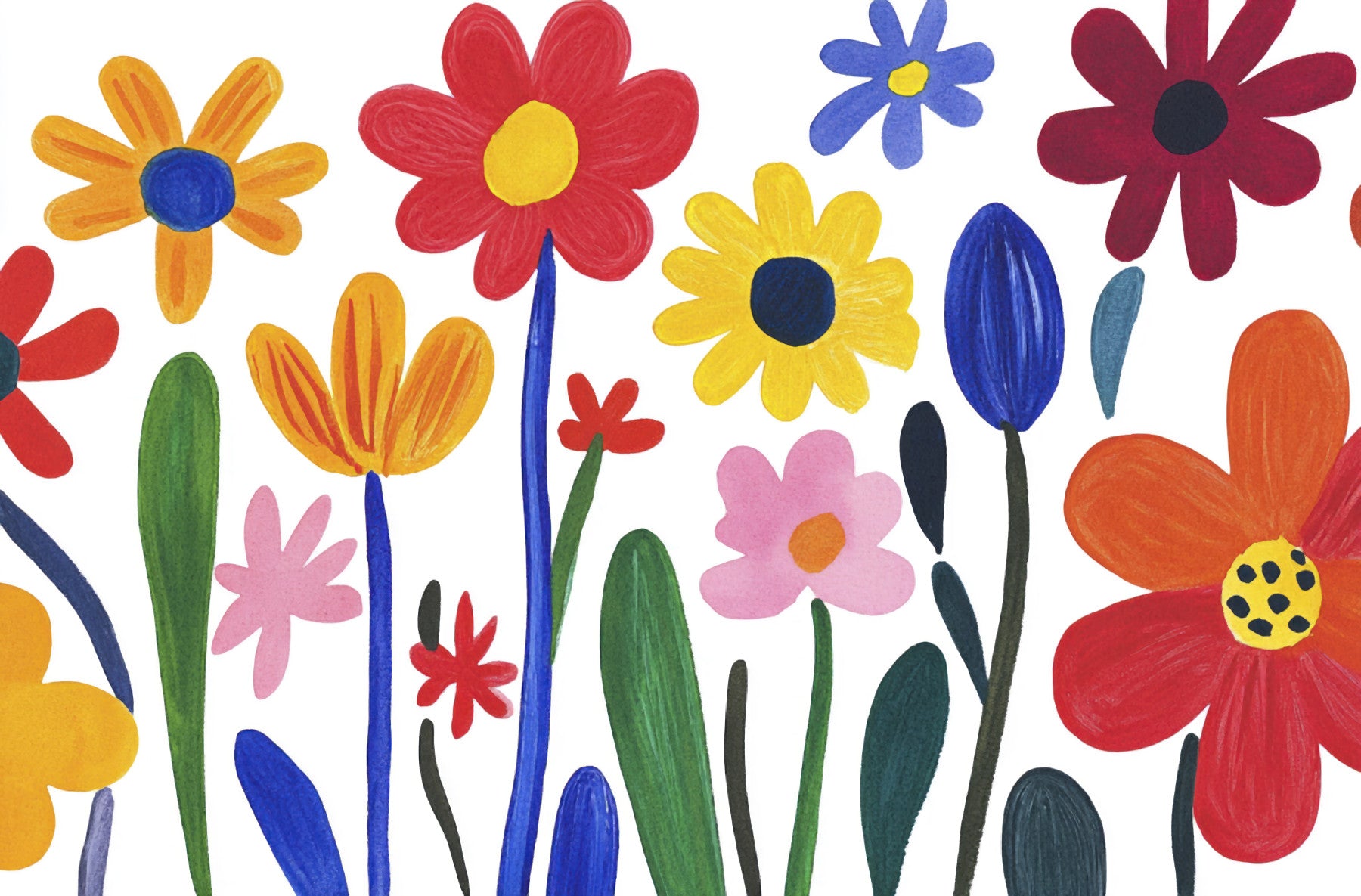 Embrace the joy of spring year-round with this whimsical floral wallpaper. The design showcases a medley of boldly colored, simplified flower forms in a vibrant palette. Reds, yellows, blues, and pinks are rendered in a charming, hand-painted style, exuding an effortless, artistic vibe. This playful composition is ideal for creating a cheerful and inviting space in a kids' room, playroom, or anywhere you want to add a touch of lighthearted, colorful personality. The white background keeps the look clean and modern.