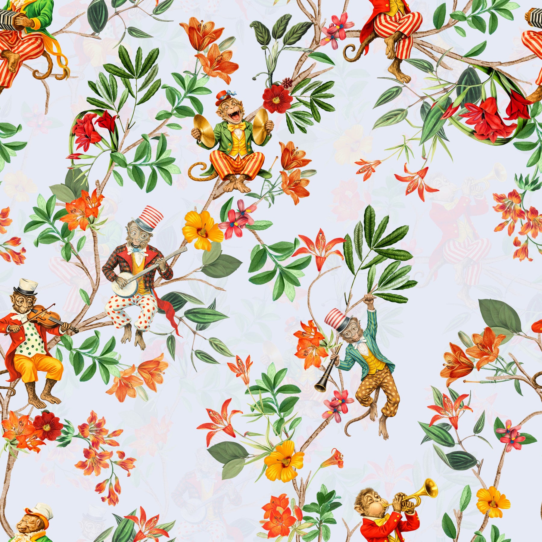 Whimsical Monkeys Playing Music Vintage Exotic Fun Garden blue Wallpaper⁠