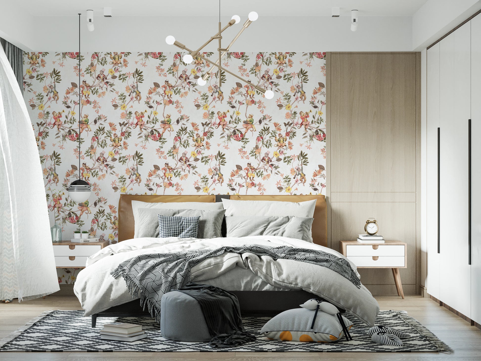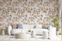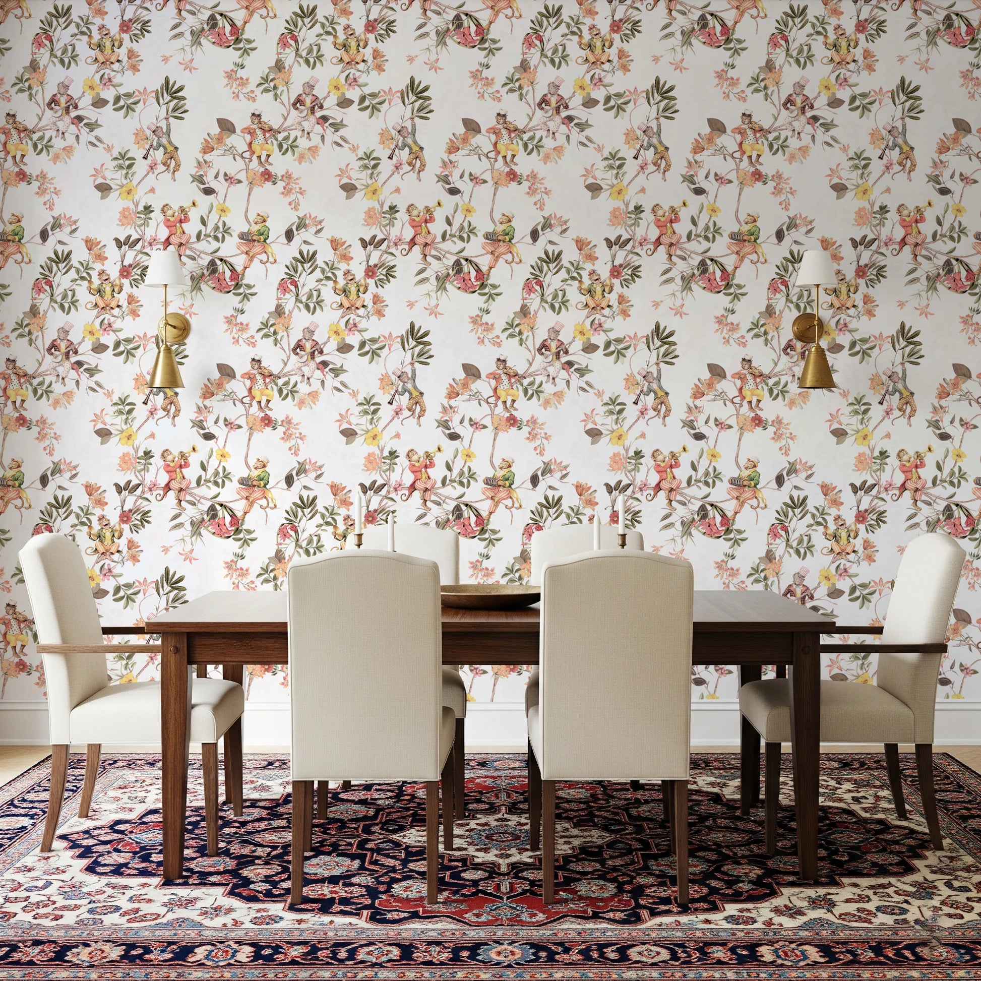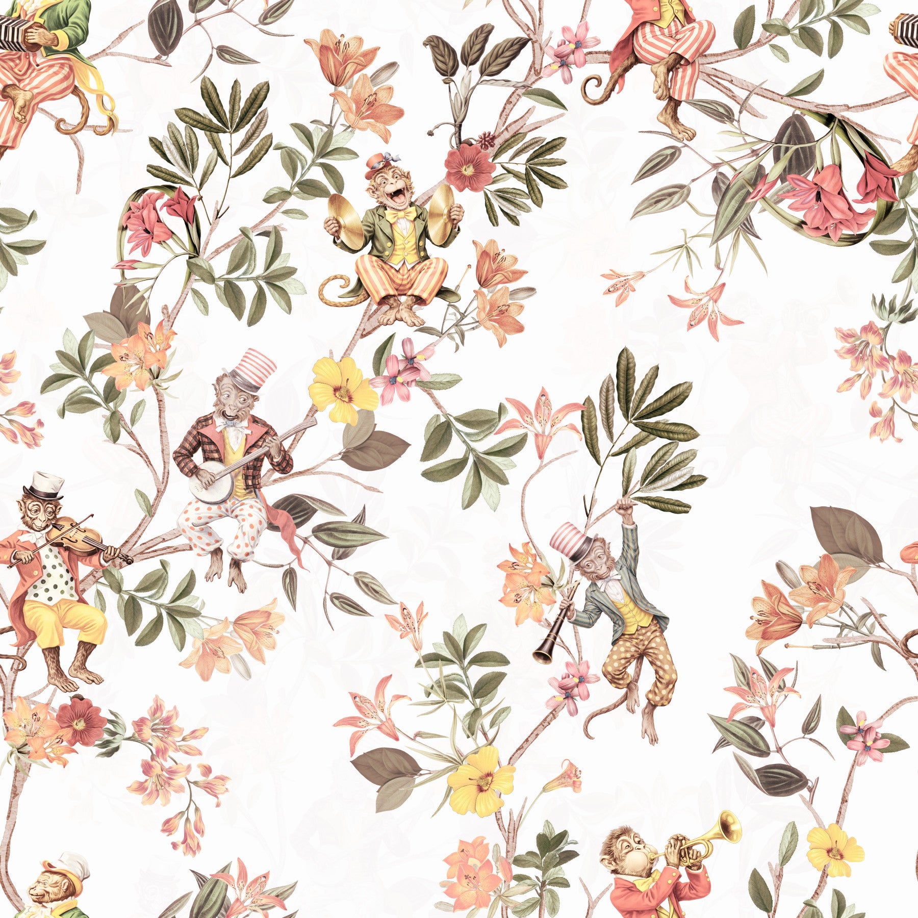 Whimsical Monkeys Playing Music Vintage Exotic Fun Garden white Wallpaper⁠