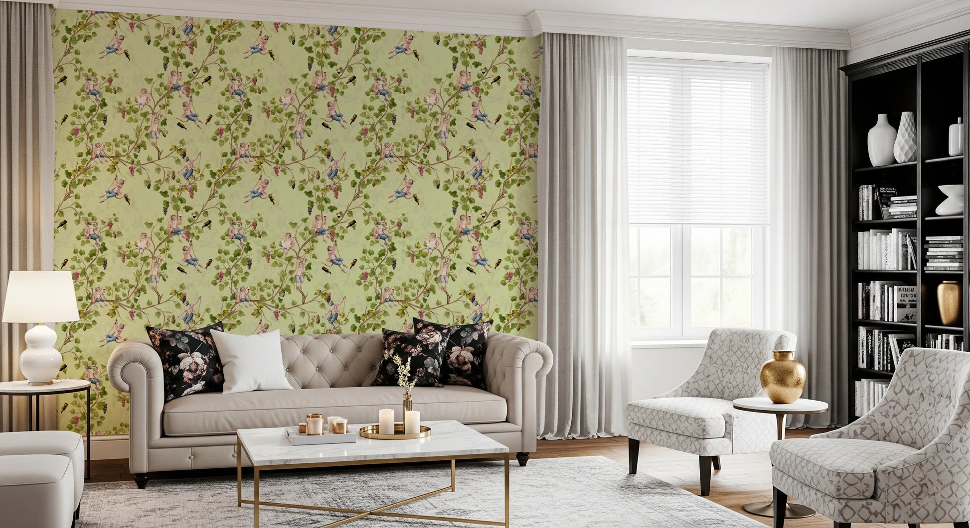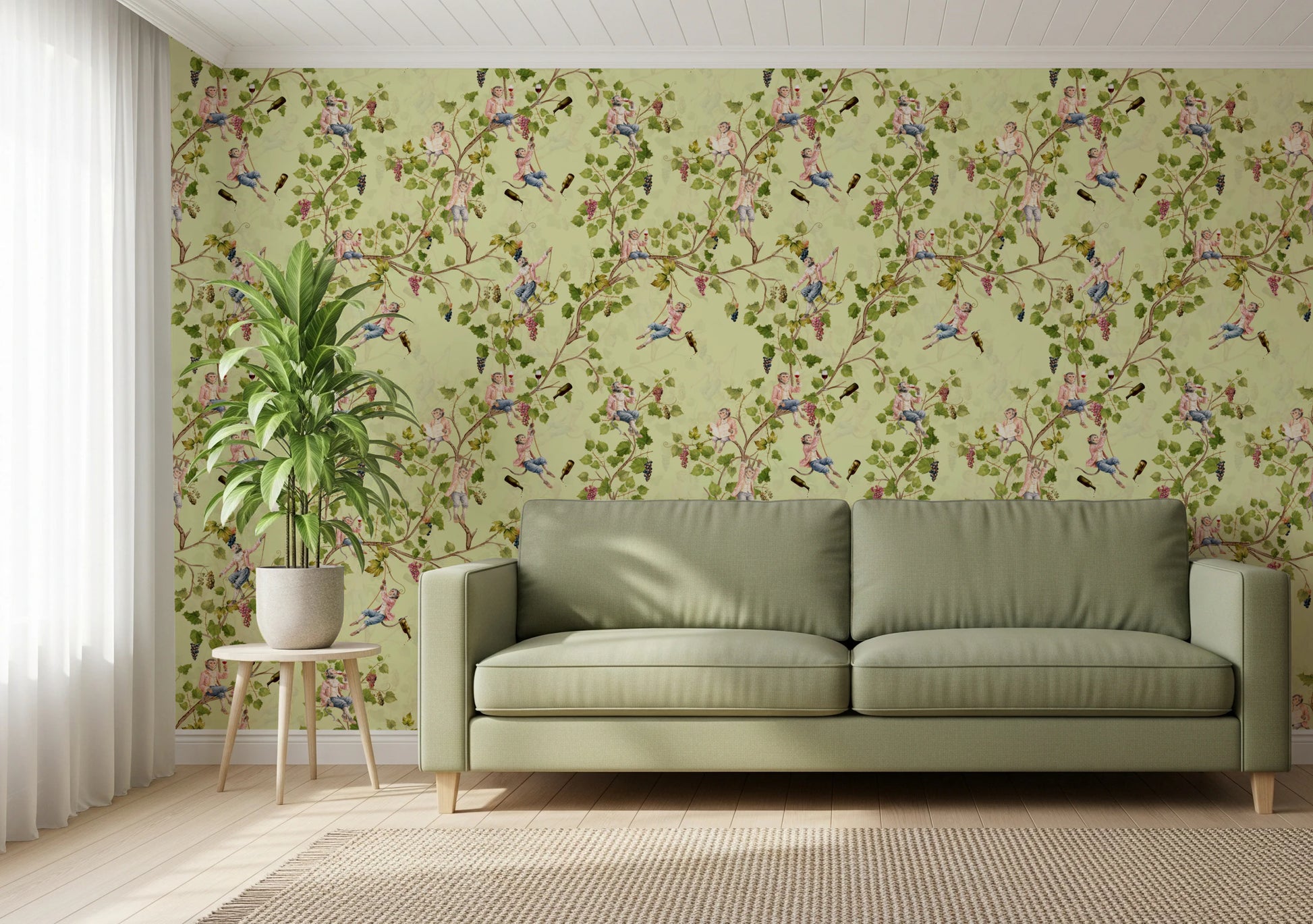 Whimsical Rococo Monkeys Wine Festival Aristocratic Vineyard Vintage Garden green Wallpaper⁠