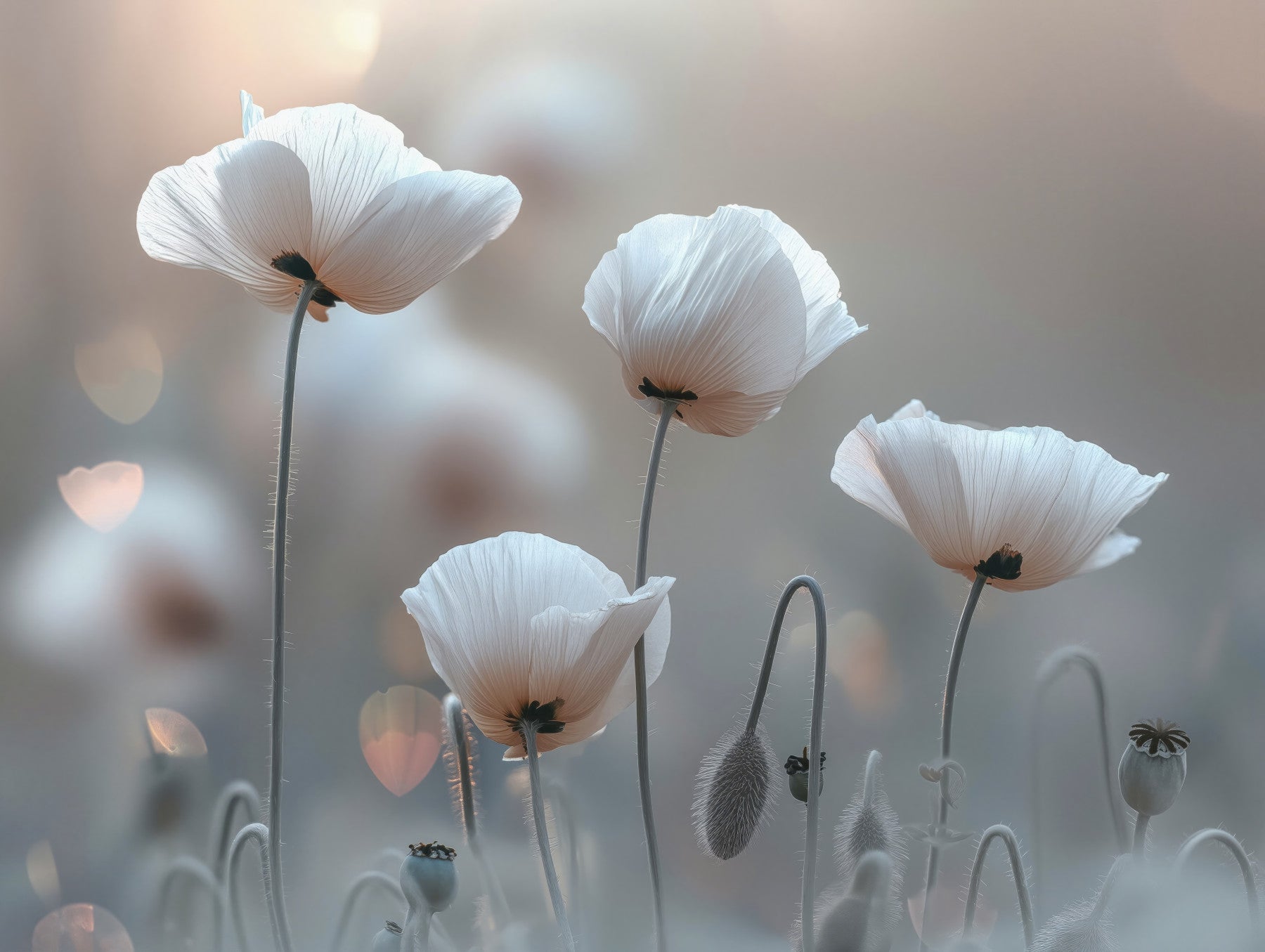 Ethereal white poppies with soft petals and graceful stems.