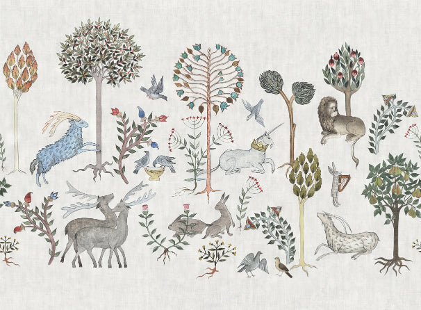 Revitalize your child's nursery with the enchanting, whimsical wildlife wallpaper mural. Every panel is animated with playful deer, sage owls, and all manner of forest fauna, all of which tell their own story in a way that engages and informs. This nursery wallpaper decorates and helps the children learn, arouses curiosity and stimulates creative expressivity. Mix it with light wood furniture for calming, naturalistic, or go-for burst colours to create a dynamic, engaging space for all to enjoy. The highly detailed design and deliberate positioning of every animal allow a story for children to lose themselves in, over and over again, encouraging learning through visual interaction.