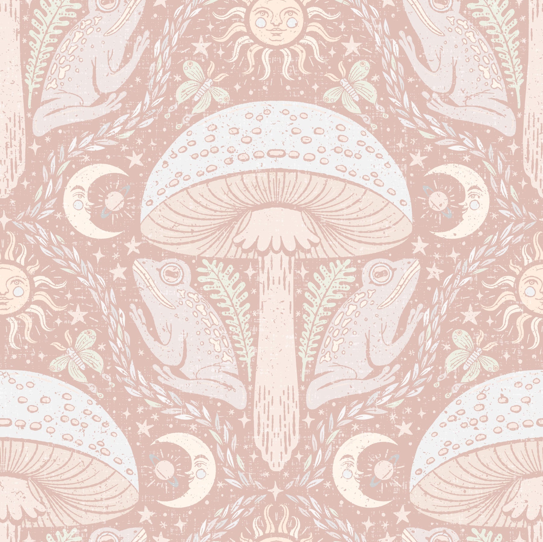 Embrace whimsical darkness with Whimsigothic Toadstools Ayara Pastel-01. This enchanting wallpaper features a dreamy pastel palette, blending soft pinks and creams with intricate illustrations of toadstools, celestial bodies, and serene frogs. The design evokes a gothic fairytale aesthetic, with its detailed line art and charmingly eerie elements. Moons and suns share the space with delicate foliage and whimsical butterflies, creating a captivating, otherworldly scene that's both playful and sophisticated. Perfect for adding a touch of magical mystery to your digital space.