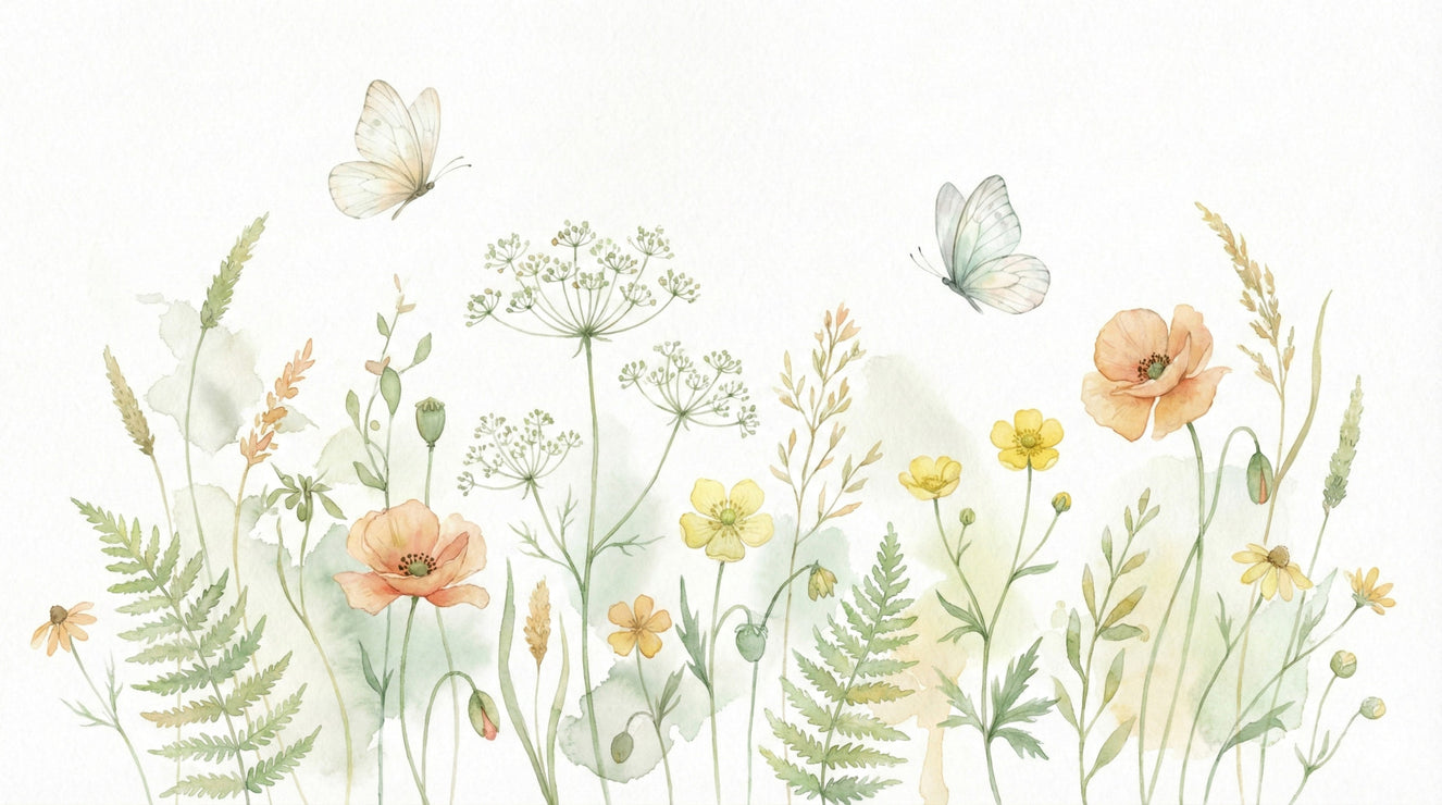 Nature-inspired wallpaper with toadstools and florals