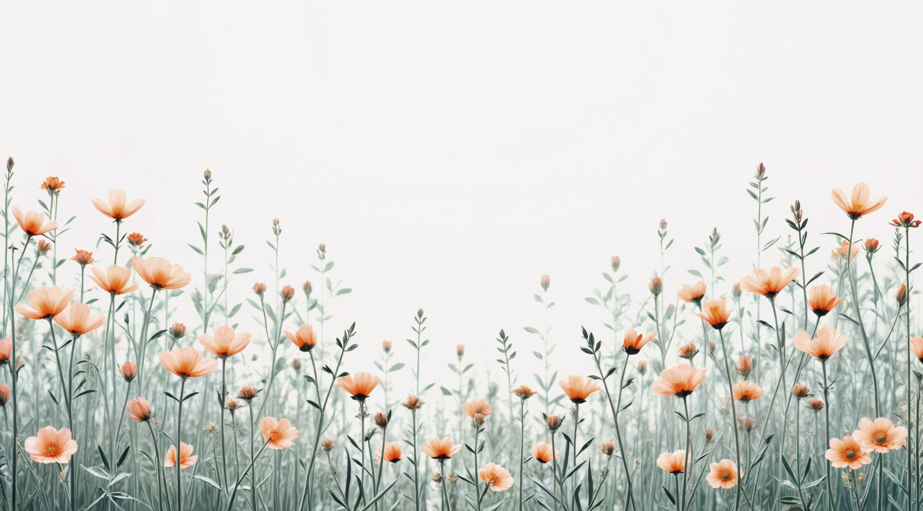 Introduce a tranquil garden atmosphere with this stunning wallpaper. Delicate peach cosmos flowers gently sway amidst thin green stems, set against a bright white backdrop. This graceful design offers a soft, romantic touch to bedrooms, creating a relaxing sanctuary. The subtle color palette extends into living areas, bringing organic elegance to gatherings. Consider it for kitchens to enhance a charming, fresh aesthetic. This wallpaper for walls seamlessly blends with both modern and classic decor, adding a dash of nature's beauty to your space.
