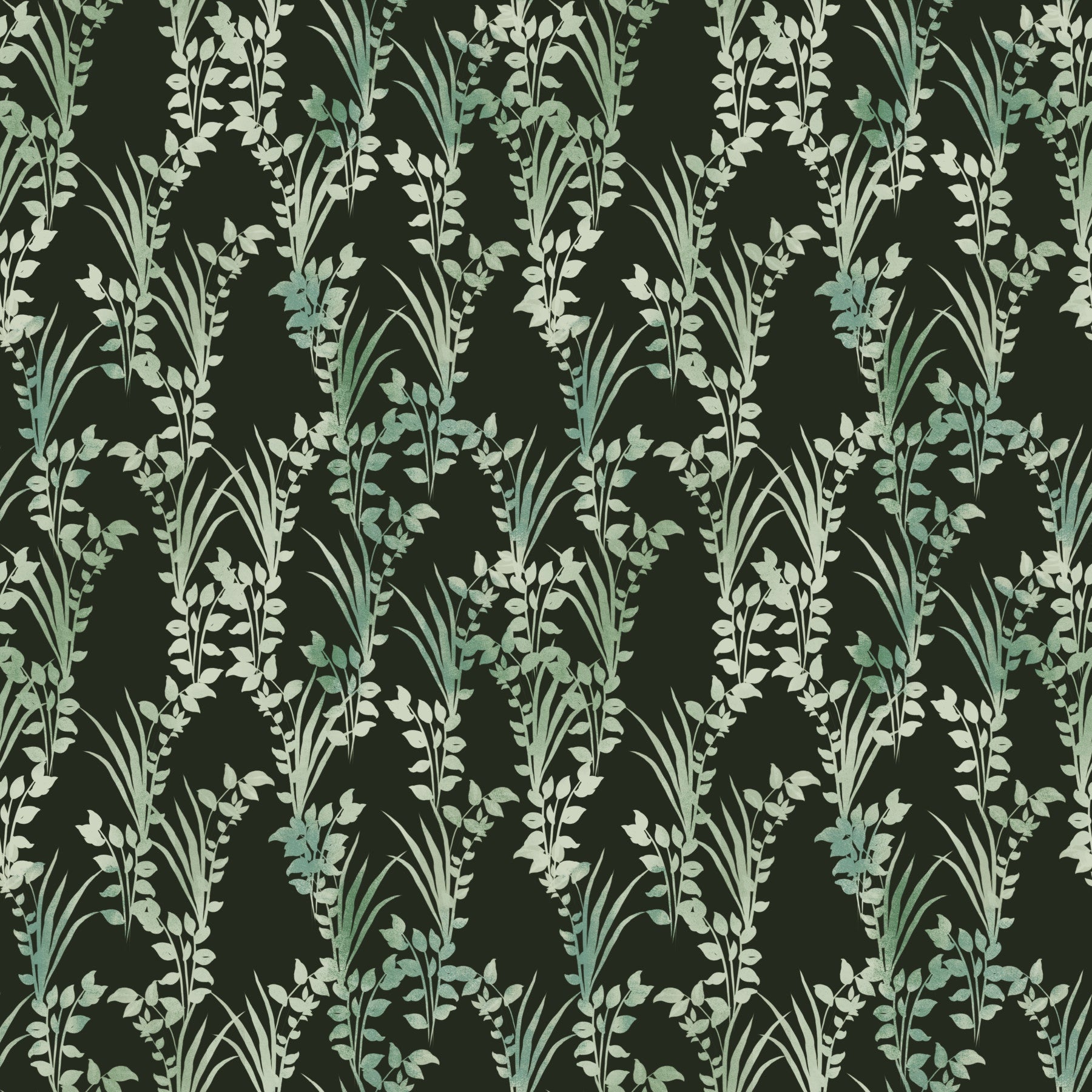 Invite tranquility into your home with this enchanting botanical design. Light green leaves and slender grass stems make an attractive pattern across a deep background. Apply this lovely wallpaper for walls to create a soothing atmosphere. It works beautifully in a bedroom, offers a calm presence to a living room, or freshens up a hallway. This elegant design complements interiors, and brings a serene touch.