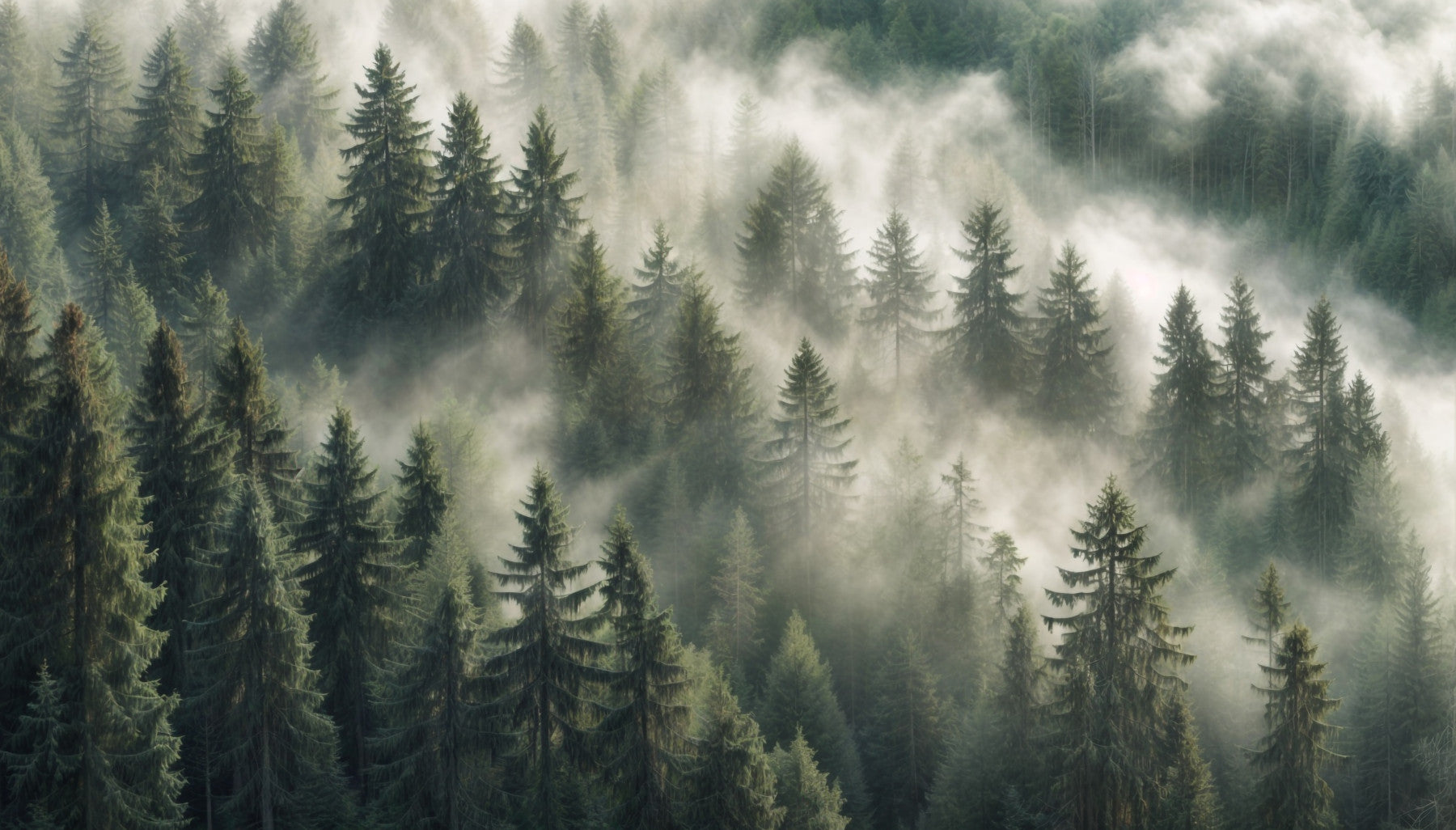 Experience the gentle whisper of the wind through the pines with this captivating wallpaper. A high-altitude view showcases a vast evergreen forest draped in a soft blanket of fog. The interplay of light and shadow through the mist creates a dramatic yet peaceful atmosphere. The deep greens and muted greys evoke a sense of calm and mystery, making it ideal for creating a tranquil space. This image is a perfect blend of serenity and natural wonder.