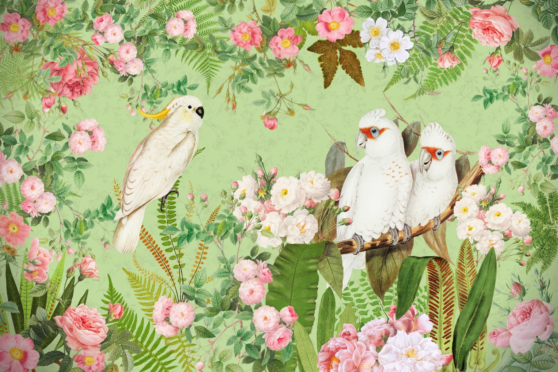 This wallpaper captures a moment of serene beauty in a lush garden. Intricate illustrations of pink roses and ferns form a captivating backdrop for three majestic white cockatoos perched on a branch. The soft, muted color palette creates a tranquil ambiance, perfect for spaces needing a touch of sophisticated natural charm. The detailed artwork transports you to a peaceful retreat, making it ideal for bedrooms, living rooms, or any room needing a calming atmosphere.