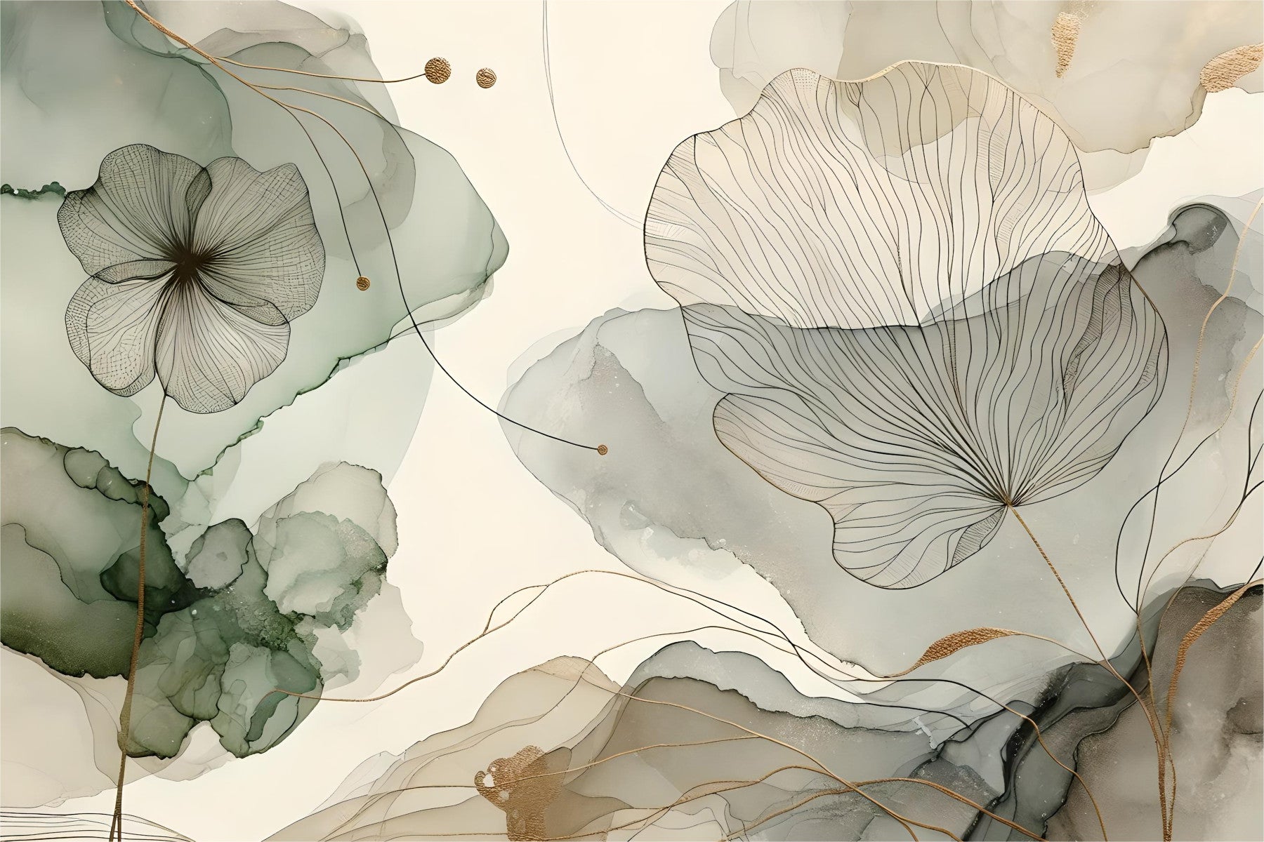 This wallpaper evokes a sense of tranquility with its abstract botanical design. Delicate line art flowers and leaves are delicately layered over flowing alcohol ink washes in calming shades of sage green, taupe, and off-white. Touches of gold add a touch of subtle luxury, enhancing the overall sophisticated and serene mood. Perfect for creating a peaceful atmosphere in bedrooms, living rooms, or meditation spaces, this design balances elegance and a calming aesthetic. The subtle color palette and fluid forms create a visually soothing experience, promoting relaxation and a sense of calm.