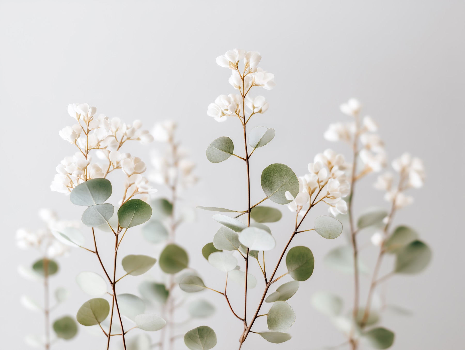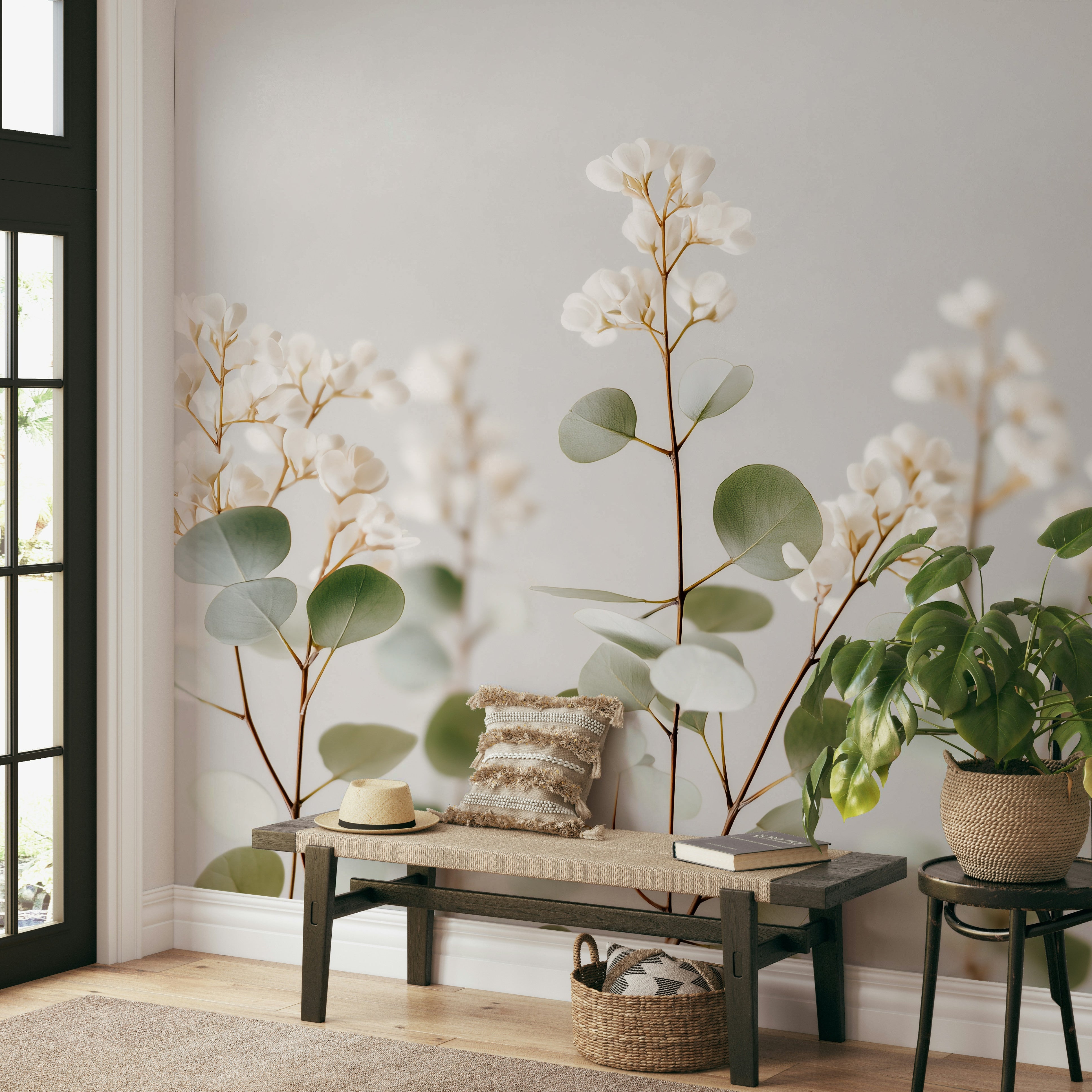 Invite tranquility into your home with this elegant wallpaper for walls, showcasing delicate white flowers and serene green eucalyptus. The design evokes a sense of calm and sophistication. Its understated beauty creates a welcoming atmosphere in any space. This wallpaper works beautifully in bedrooms, hallways, or even a home office. The gentle palette complements a wide range of decors, adding a subtle touch of nature indoors. Perfect for creating a peaceful retreat.