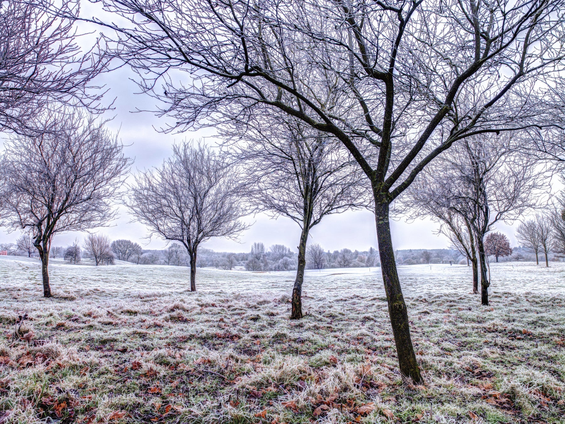 Trees in frosty field. Immerse yourself in the tranquil beauty of "Frosted Meadow Dream," a wallpaper that captures the ethereal essence of a winter's embrace. This stunning image showcases a serene meadow, lightly dusted with frost, where skeletal trees stand as silent sentinels against a pale sky. Each branch is delicately outlined with ice crystals, creating a mesmerizing display of natural artistry. The ground, a tapestry of frosted grass and fallen leaves, shimmers with a subtle iridescence, reflecting the soft, diffused light of the overcast day. Perfect for those seeking a touch of serene beauty and quiet contemplation, this wallpaper brings the serene chill of a winter landscape into your digital space. Let the delicate frostwork and muted tones transform your screen into a tranquil window, offering a peaceful escape from the hustle and bustle of daily life. Experience the quiet majesty of nature's artistry with "Frosted Meadow Dream."