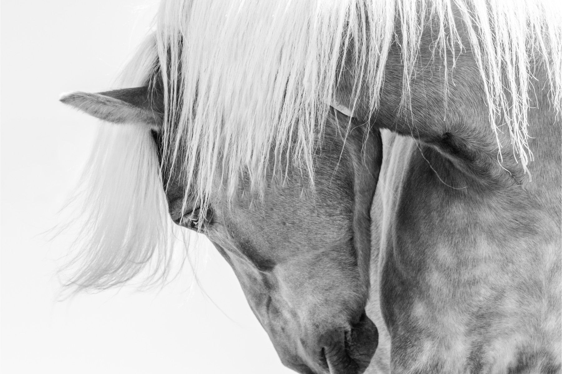 Elevate your interior with this captivating black and white wallpaper. The image centers on a horse, showcasing the animal's gentle demeanor and sophisticated form. The subtle gradations provide a sense of depth, suitable for various spaces. This wallpaper for walls adds a touch of understated luxury to any room. Its minimalistic style complements modern decor and creates a peaceful sanctuary in your home office, study or bedroom, enhancing the overall atmosphere.