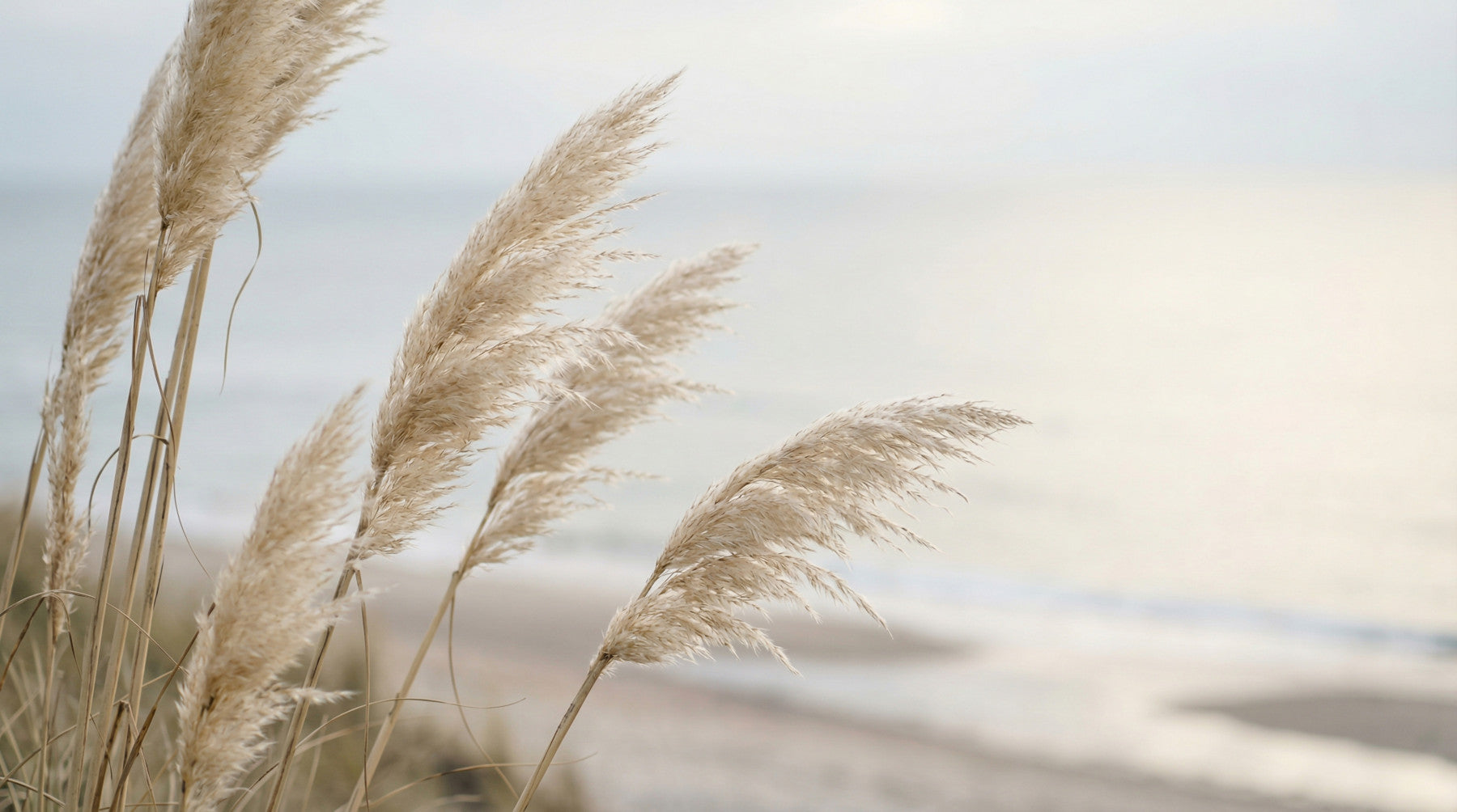 This exquisite wallpaper for walls captures the delicate beauty of pampas grass swaying gently against a serene coastal backdrop. Soft, feathery plumes in warm beige and cream tones fill the foreground, presenting an inviting texture. A blurred background reveals distant waves and a calming, muted sky in soft greys and pale blues. This design infuses any room with a sense of tranquility and natural elegance. It creates a peaceful and airy atmosphere, ideal for a serene bedroom retreat, a calming living room, or a spa-like bathroom. The subtle color palette and organic theme enhance interior spaces by bringing a relaxed, minimalist, and sophisticated touch.