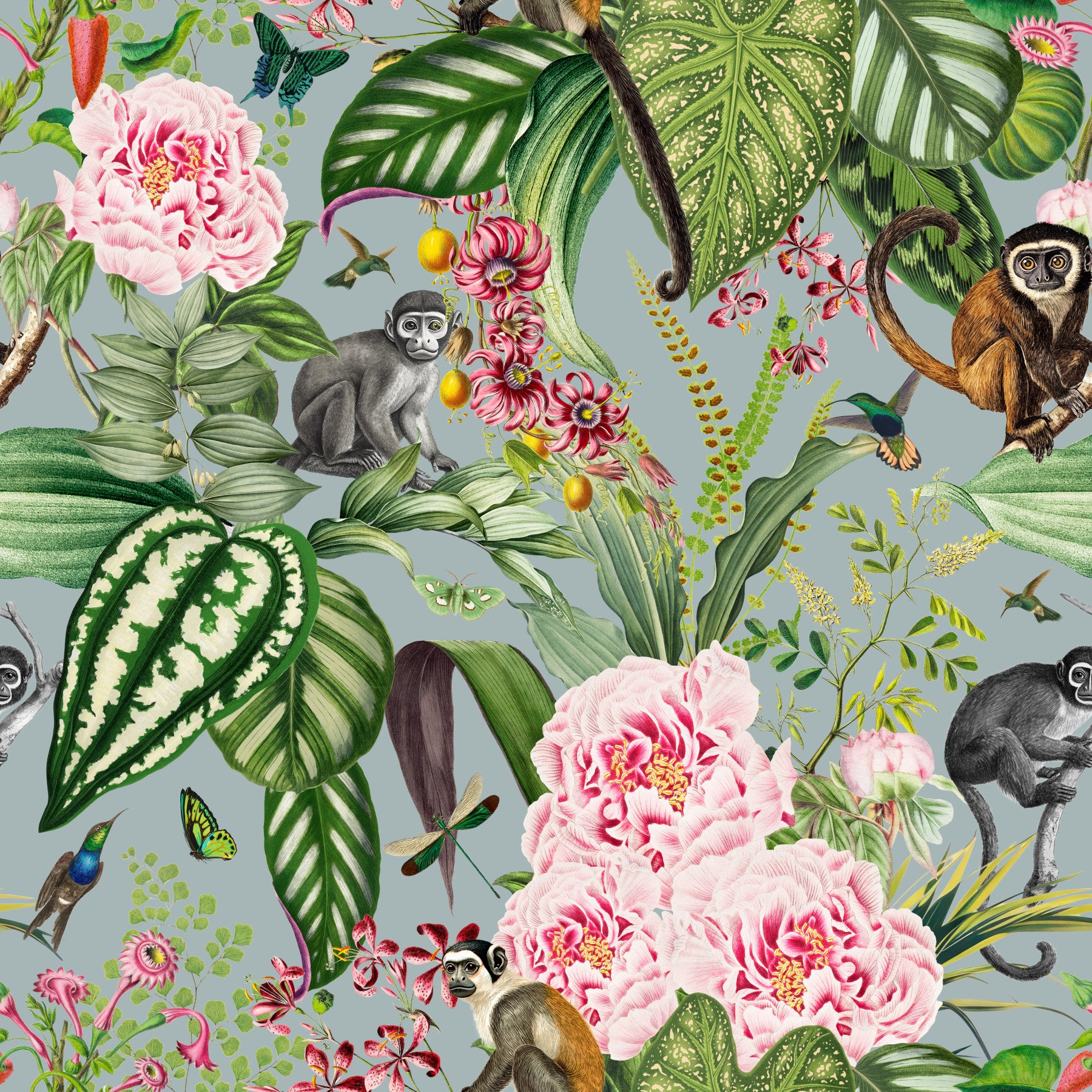 Immerse yourself in the lush beauty of 'Whispers of the Jungle,' a captivating wallpaper design. Intricate botanical illustrations of vibrant pink peonies and exotic tropical foliage intertwine seamlessly with meticulously detailed monkeys and hummingbirds. The soft, muted grey background enhances the rich colors of the flora and fauna, creating a serene yet exotic atmosphere. This wallpaper transports you to a hidden paradise, perfect for adding a touch of elegance and whimsy to any room. The vintage aesthetic, combined with the lively jungle imagery, promises a refreshing and captivating statement piece for your home.