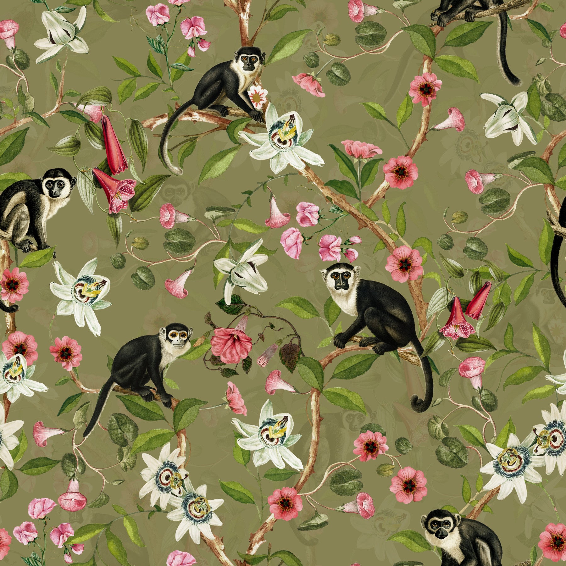 Immerse yourself in the lush beauty of 'Whispers of the Jungle,' a wallpaper design that captures the serene essence of a hidden tropical paradise. Intricate watercolor illustrations of monkeys playfully perched amongst vibrant blossoms create a captivating scene. Delicate pink and red flowers, along with elegant white blooms, intertwine with lush green foliage, forming a mesmerizing tapestry. The muted olive-green background enhances the overall calming effect, making it ideal for creating a tranquil and sophisticated atmosphere in any space. This wallpaper's unique blend of artistry and nature will transform your walls into a captivating work of art.