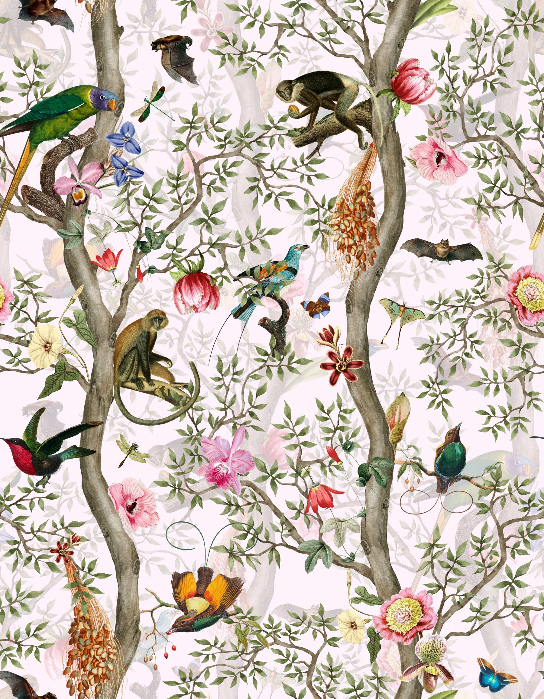 Immerse yourself in the mysteries of the jungle with this captivating wallpaper. Detailed illustrations of exotic birds, playful monkeys, and nocturnal bats weave through a dense tapestry of vibrant flowers and lush foliage. The soft watercolor style creates a dreamlike atmosphere, while the rich colors and intricate details capture the beauty and wonder of the natural world. This wallpaper is a perfect addition to any space seeking a touch of mystery and elegance, inviting a sense of tranquil escape.