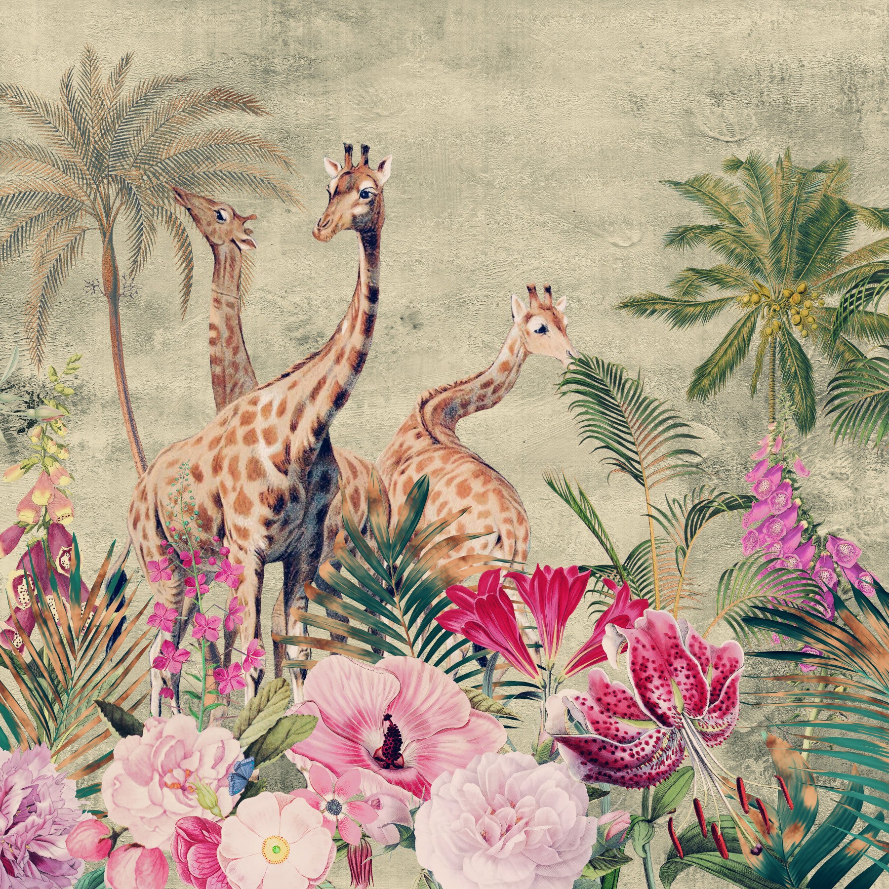 Escape to the serene beauty of the African savannah with this exquisite wallpaper. Three giraffes, rendered in a delicate watercolor style, stand majestically amidst a vibrant array of tropical flowers and palm trees. The soft, muted color palette evokes a sense of tranquil calm, while the detailed botanical elements add a touch of sophistication. This wallpaper is a perfect blend of nature's elegance and the wild beauty of Africa, ideal for creating a peaceful and captivating atmosphere.