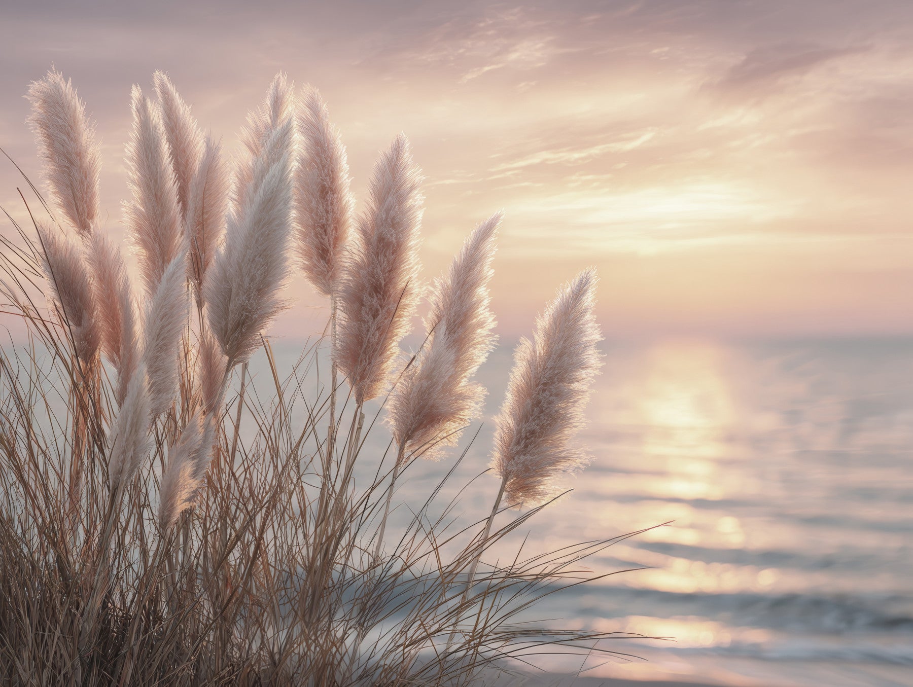 Drift away with 'Whispers of the Shore', a wallpaper that captures the serene beauty of a coastal sunset. The image features delicate pampas grass bathed in the soft, golden light of dawn or dusk, gently swaying against a backdrop of tranquil ocean waters. The gentle hues of pink, beige, and blue evoke a sense of peace and calm, creating a soothing ambiance for any space. It's a perfect choice to infuse your home with a touch of natural elegance and coastal charm, reminding you of the tranquil moments spent by the sea.