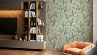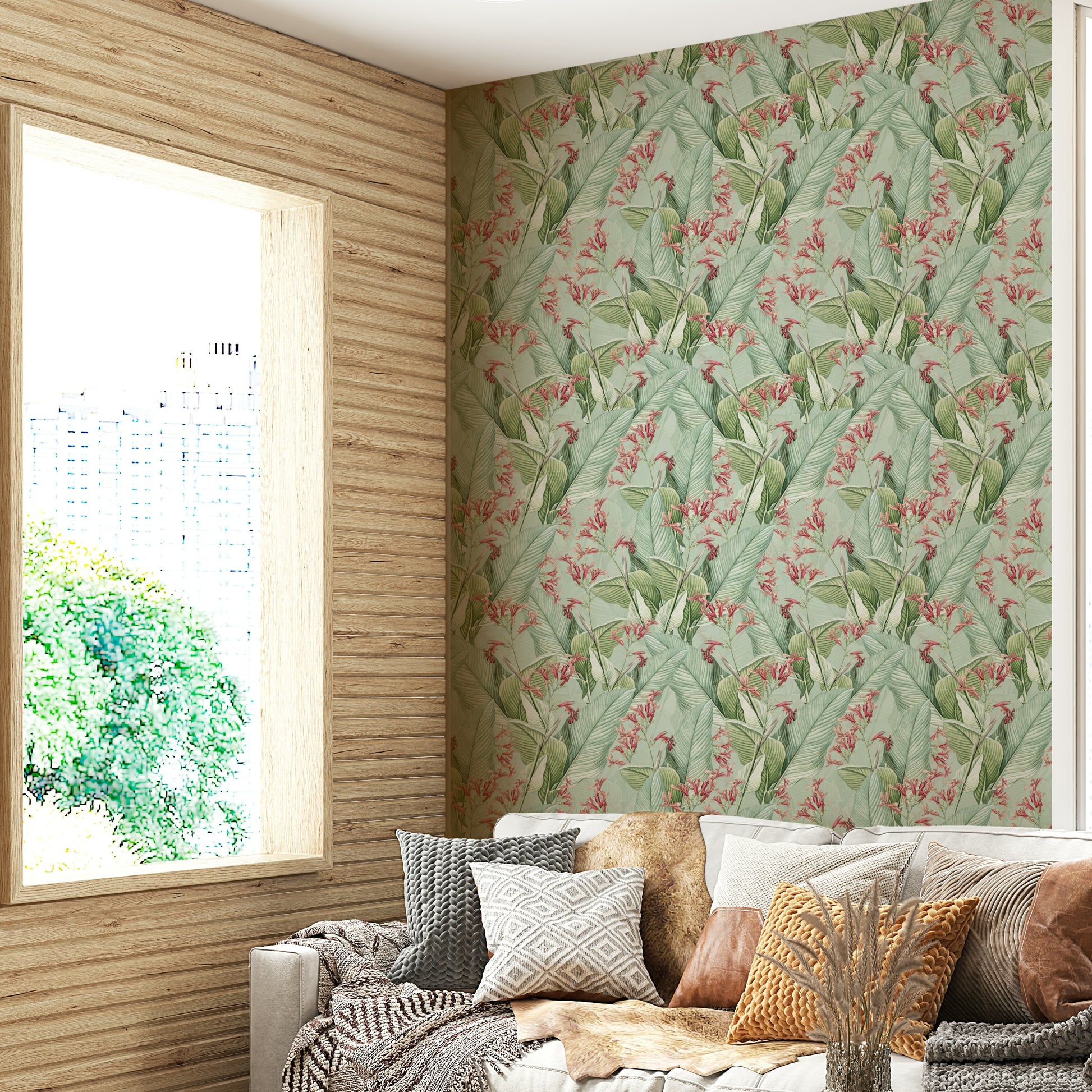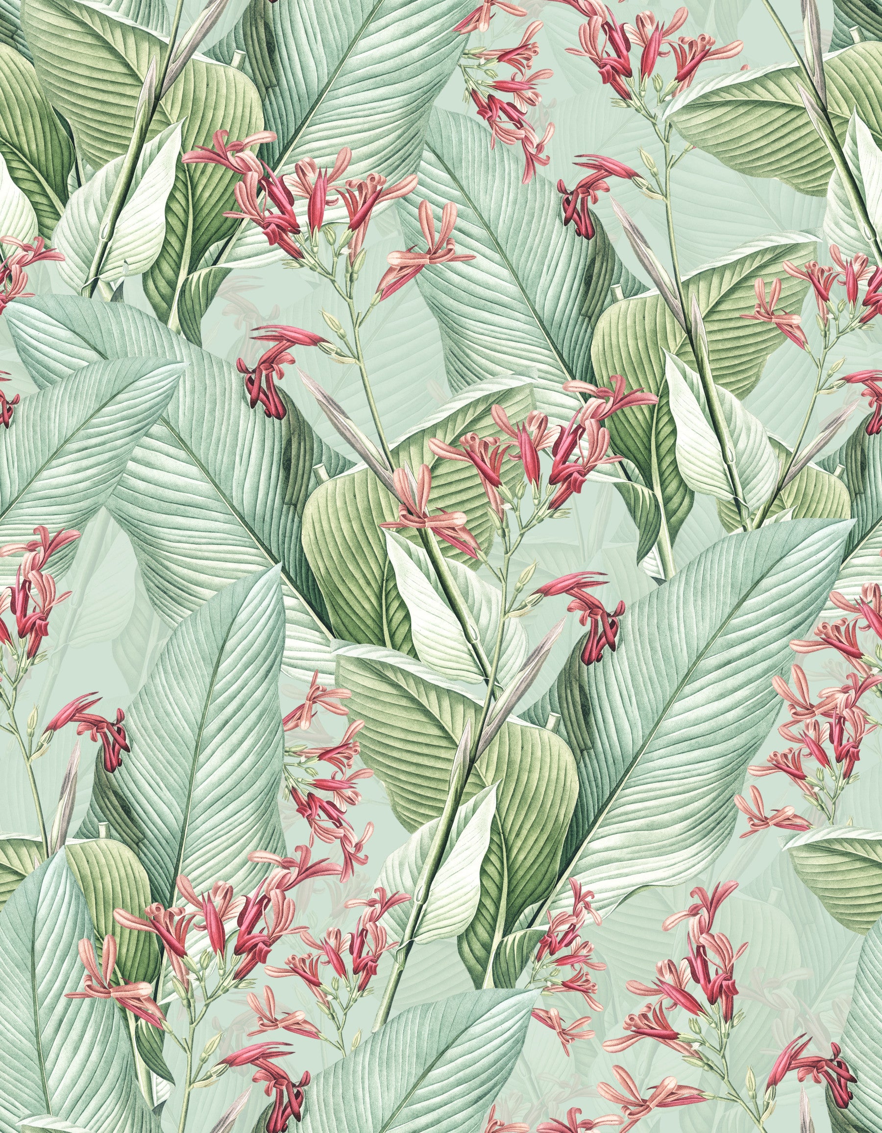 Bring the tranquility of a tropical rainforest into your home with this enchanting wallpaper. The design showcases a breathtaking array of large, textured leaves in varying shades of green, punctuated by delicate, coral-pink flowers. The subtle mint background creates a calming, almost ethereal atmosphere. The realistic, yet painterly style of the illustration makes it a sophisticated choice for adding a touch of nature-inspired elegance to any space. Ideal for creating a tranquil retreat in bedrooms, living rooms, or even bathrooms.