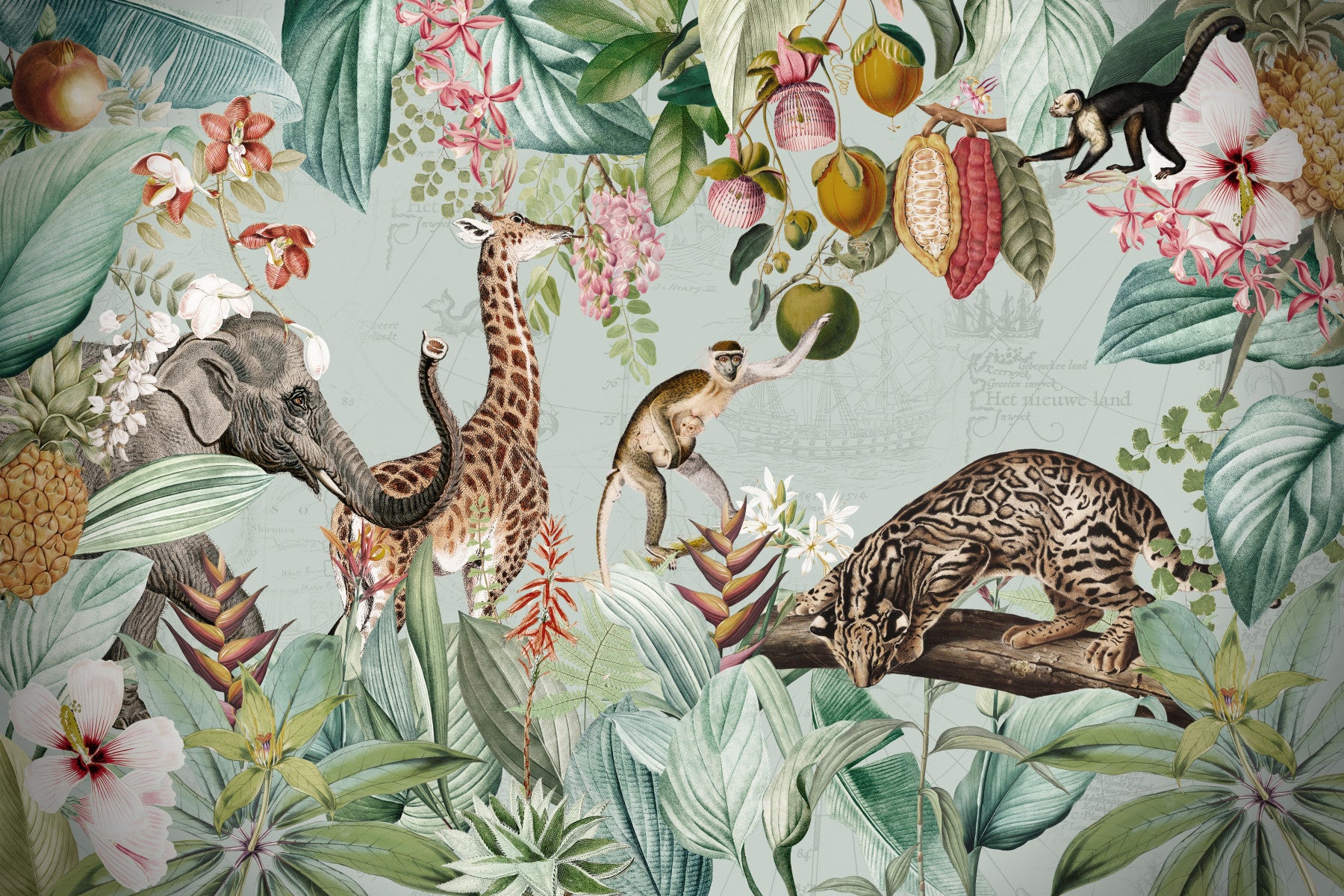 Embark on a visual journey into the heart of a lush tropical paradise with this captivating wallpaper. Intricate botanical illustrations of exotic flowers and vibrant foliage intertwine with meticulously rendered wildlife, including elephants, giraffes, monkeys, and jaguars. The muted green background, reminiscent of an antique map, adds a touch of vintage charm and exploration. This wallpaper evokes a sense of adventure and wonder, bringing the tranquility and beauty of a hidden jungle to your space. The detailed artwork is perfect for adding a unique and sophisticated touch to any room, transforming it into a haven of natural elegance.