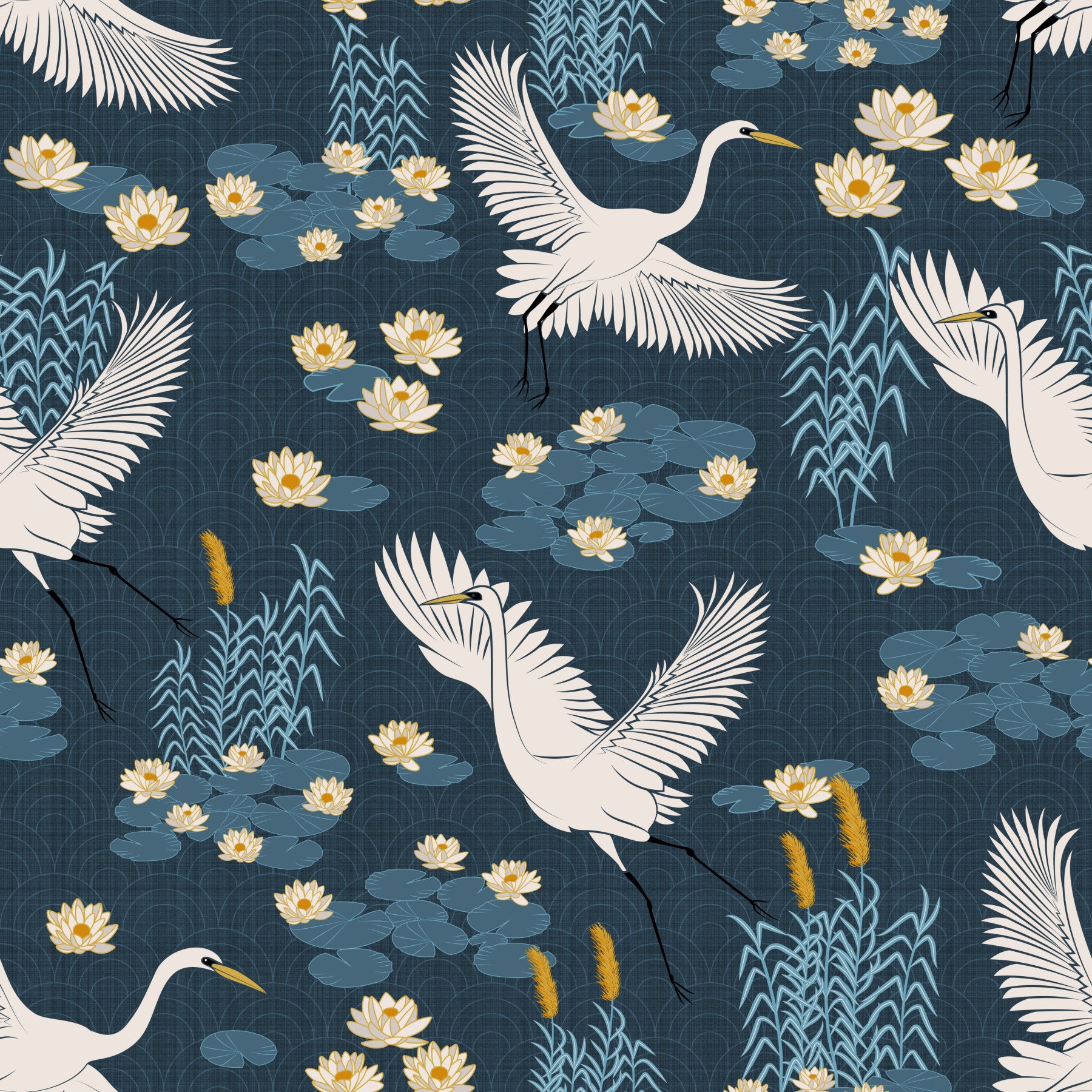 Bring the serene beauty of a Japanese garden into your home with this captivating wallpaper. Elegant white herons, wings outstretched, gracefully navigate a tranquil pond adorned with delicate waterlily blossoms. The muted blue background subtly features a textured pattern, adding depth and visual interest. The color palette is carefully curated, combining serene blues, soft creams, and subtle gold accents to create a calming and sophisticated atmosphere. Ideal for bedrooms, living rooms, or any space where you desire a sense of peaceful elegance.