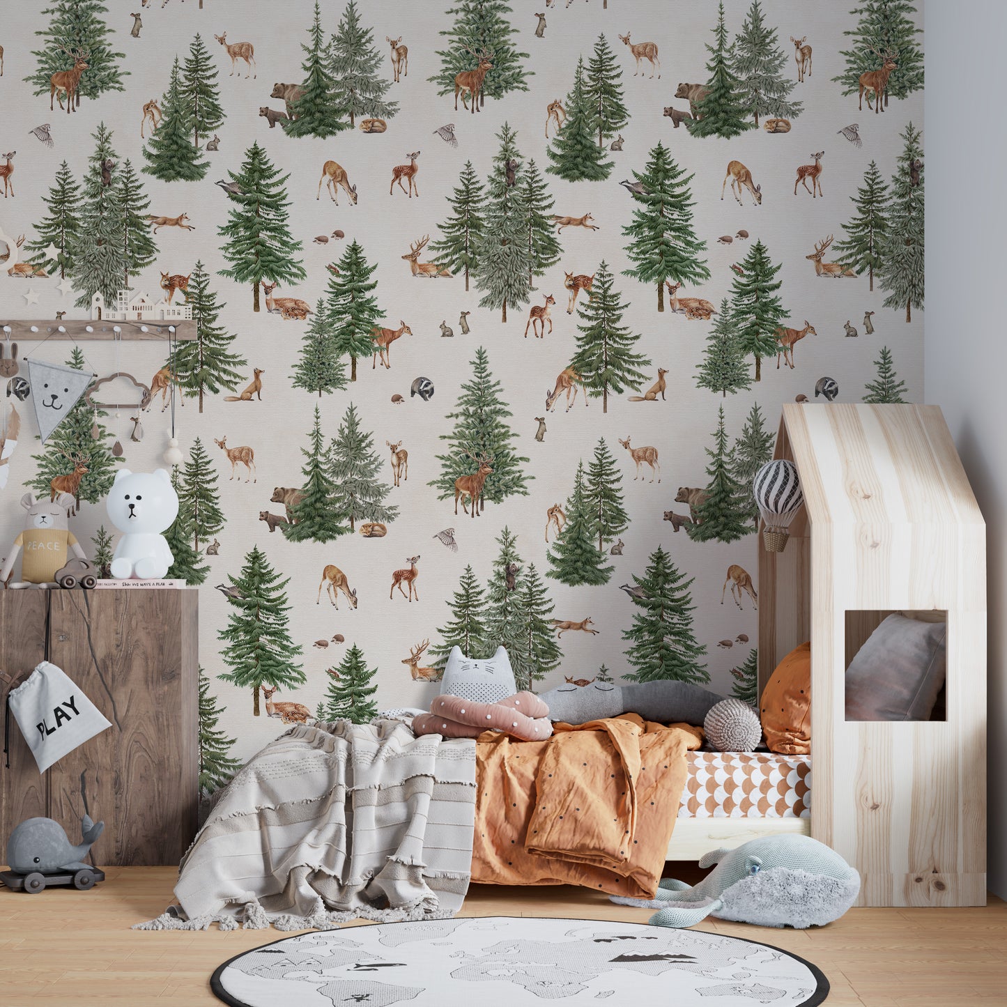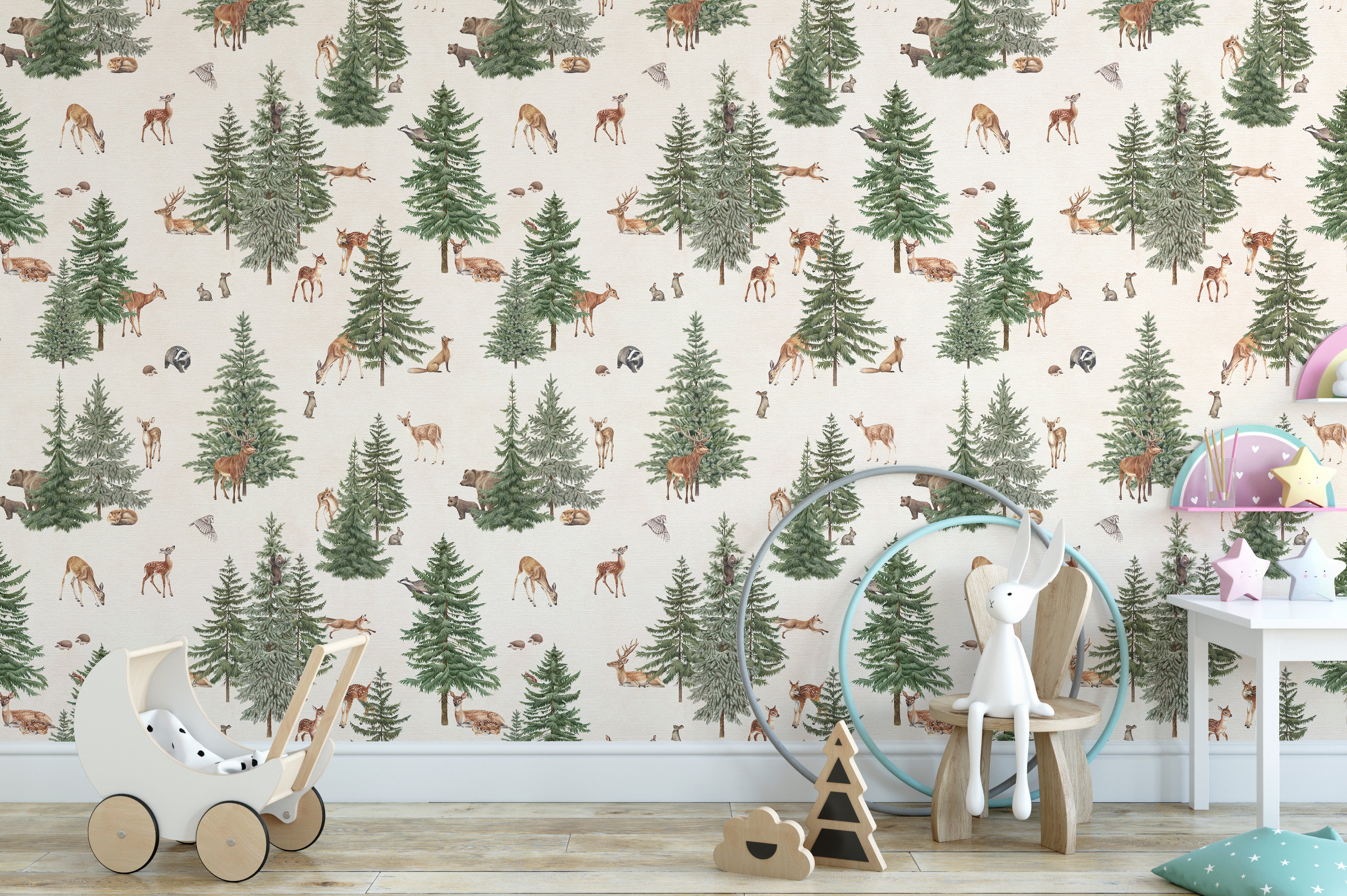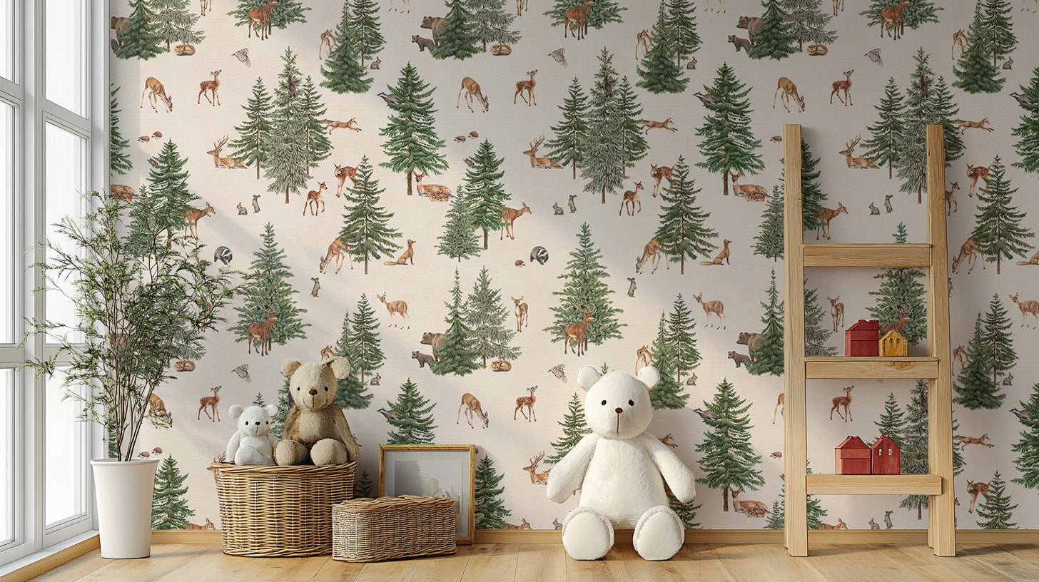 Bring the beauty of nature into your home with this White Woodland Deer Forest Wallpaper, featuring elegant deer, lush pine trees, and charming woodland animals in a serene forest setting. The crisp white background enhances the intricate watercolor details, creating a bright, airy feel perfect for nurseries, children's rooms, or rustic-inspired spaces. This timeless design blends effortlessly with both modern and classic interiors. Printed on high-quality, easy-to-apply material, it offers durability and a seamless finish. Whether designing a cozy woodland retreat or a gender-neutral nursery, this wallpaper adds a natural elegance.