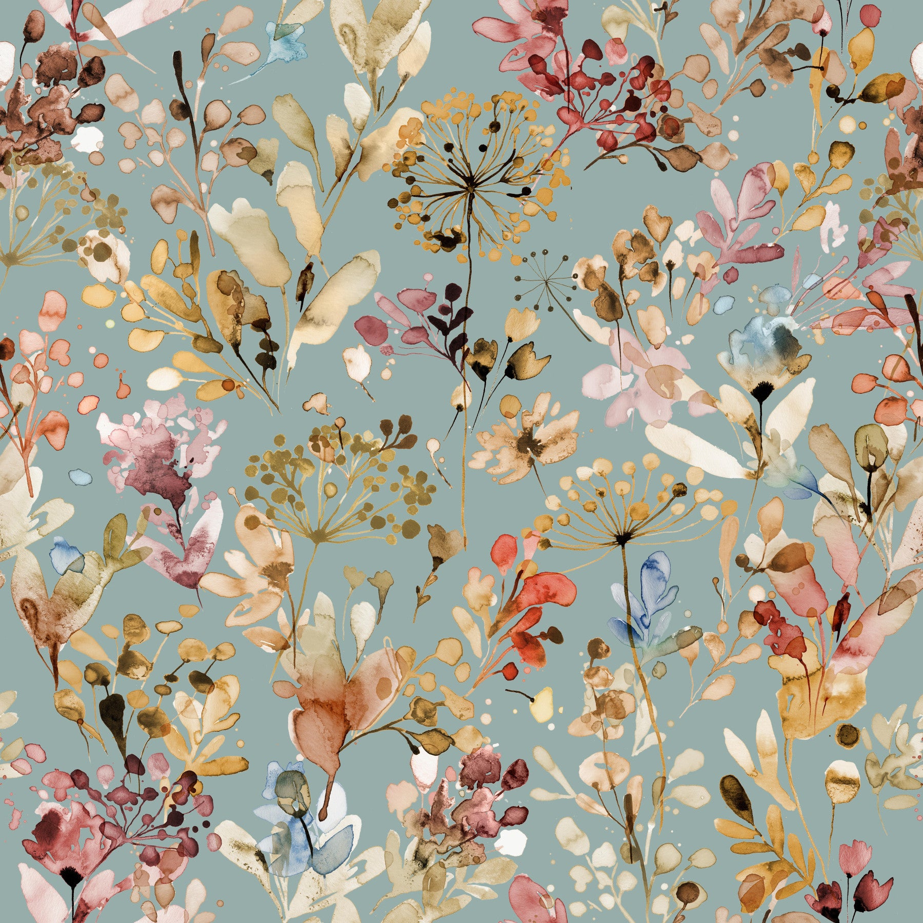 Wild meadow grass wallpaper in rich teal and gold.