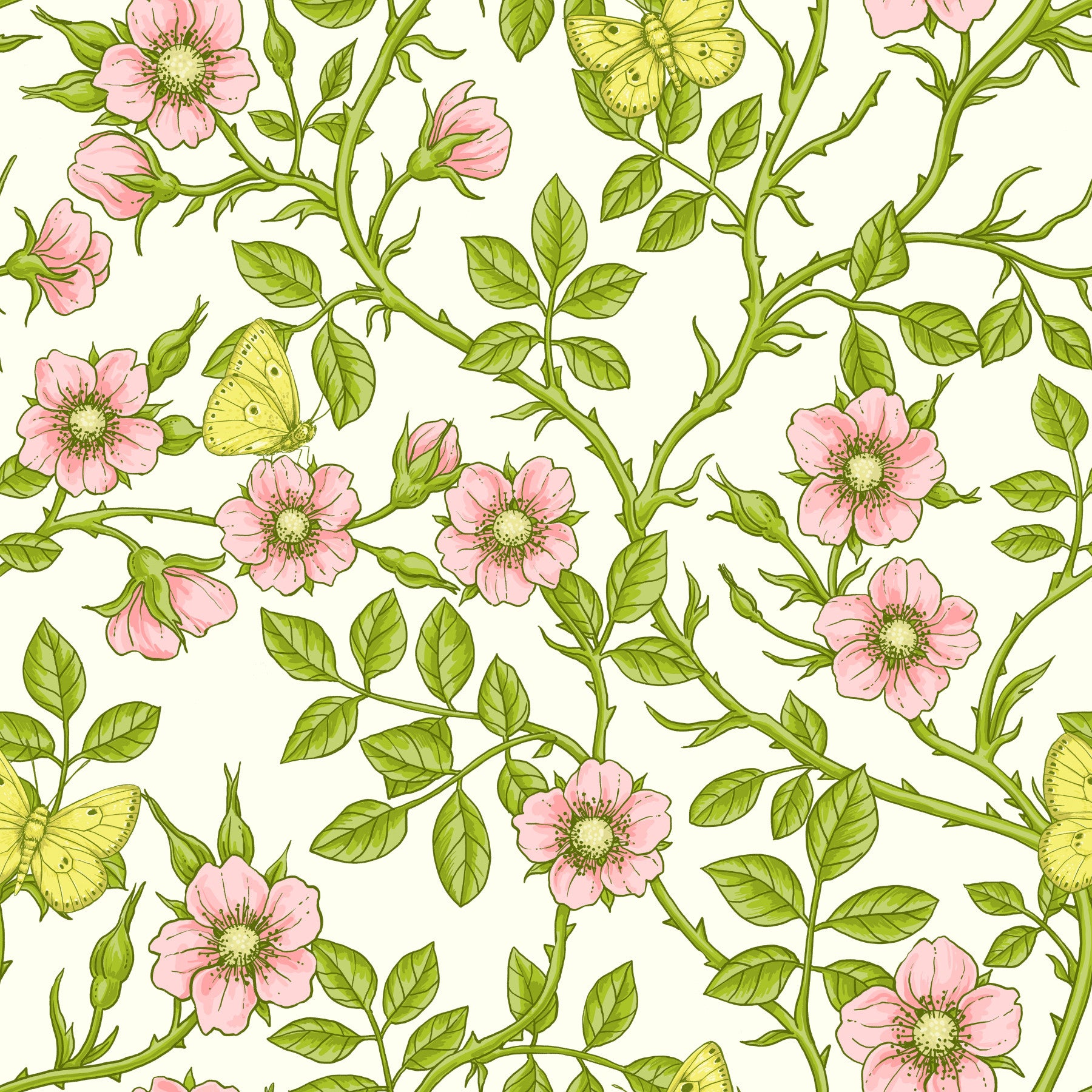 Immerse yourself in the delicate beauty of nature with this 'Wild Roses and Butterflies' wallpaper. The design features a seamless pattern of blush-pink wild roses, complete with budding promises and vibrant green foliage. Bright yellow butterflies dance among the blooms, adding a touch of whimsy and lightness to the composition. This vintage-inspired floral artwork brings a serene and romantic atmosphere to any space, perfect for those seeking a touch of natural elegance and timeless charm. The intricate details and soft color palette create a visually appealing and calming backdrop.