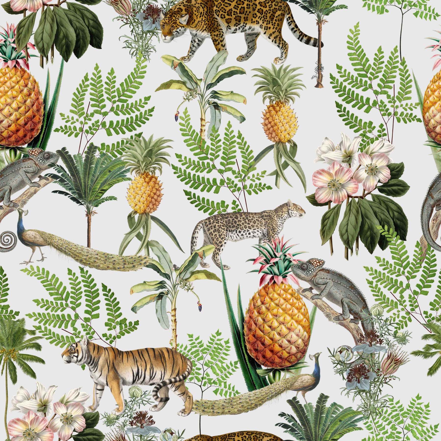 Escape to the "Wild Savana" with this lush and vibrant wallpaper. A harmonious blend of exotic wildlife and tropical flora creates a captivating visual narrative. Majestic tigers and stealthy leopards roam amidst towering palm trees, vibrant ferns, and luscious pineapples. Regal peacocks and curious chameleons add a touch of elegance and intrigue. Delicate flowers bloom in the undergrowth, enriching the scene with subtle beauty. This design encapsulates the untamed spirit and serene beauty of the savanna, bringing a touch of the exotic into any space.