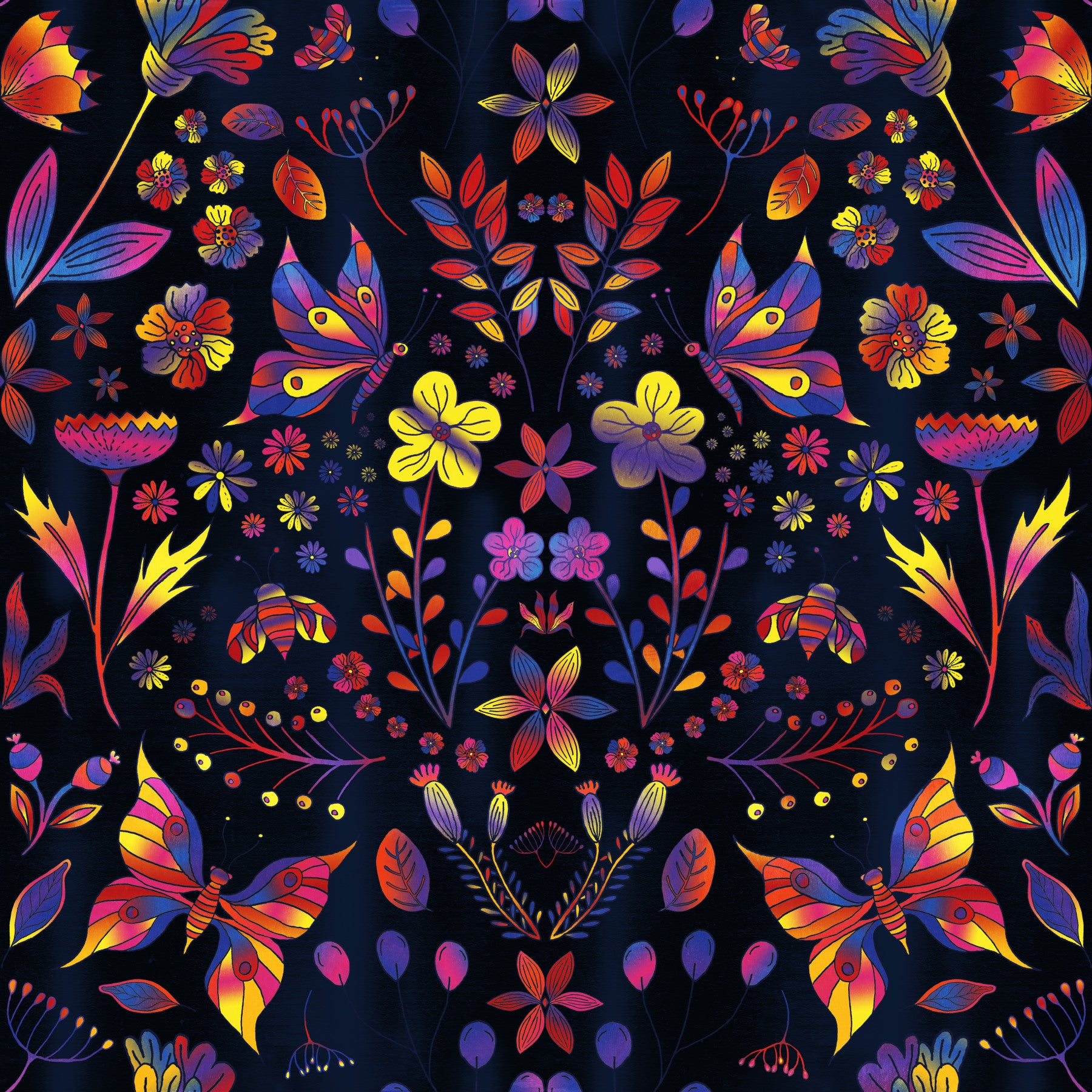 Embrace the vibrant energy of spring with this dazzling wallpaper. A symphony of richly colored flowers, butterflies, and leaves burst forth against a deep midnight blue background. The metallic sheen subtly enhances the already intense hues of the artwork, creating a luxurious and captivating visual experience. Intricate floral designs intertwine with playful butterflies, showcasing a wild, untamed beauty perfect for adding a touch of whimsical elegance to any digital space. The bold color palette and detailed artistry make this a truly unique and unforgettable wallpaper.