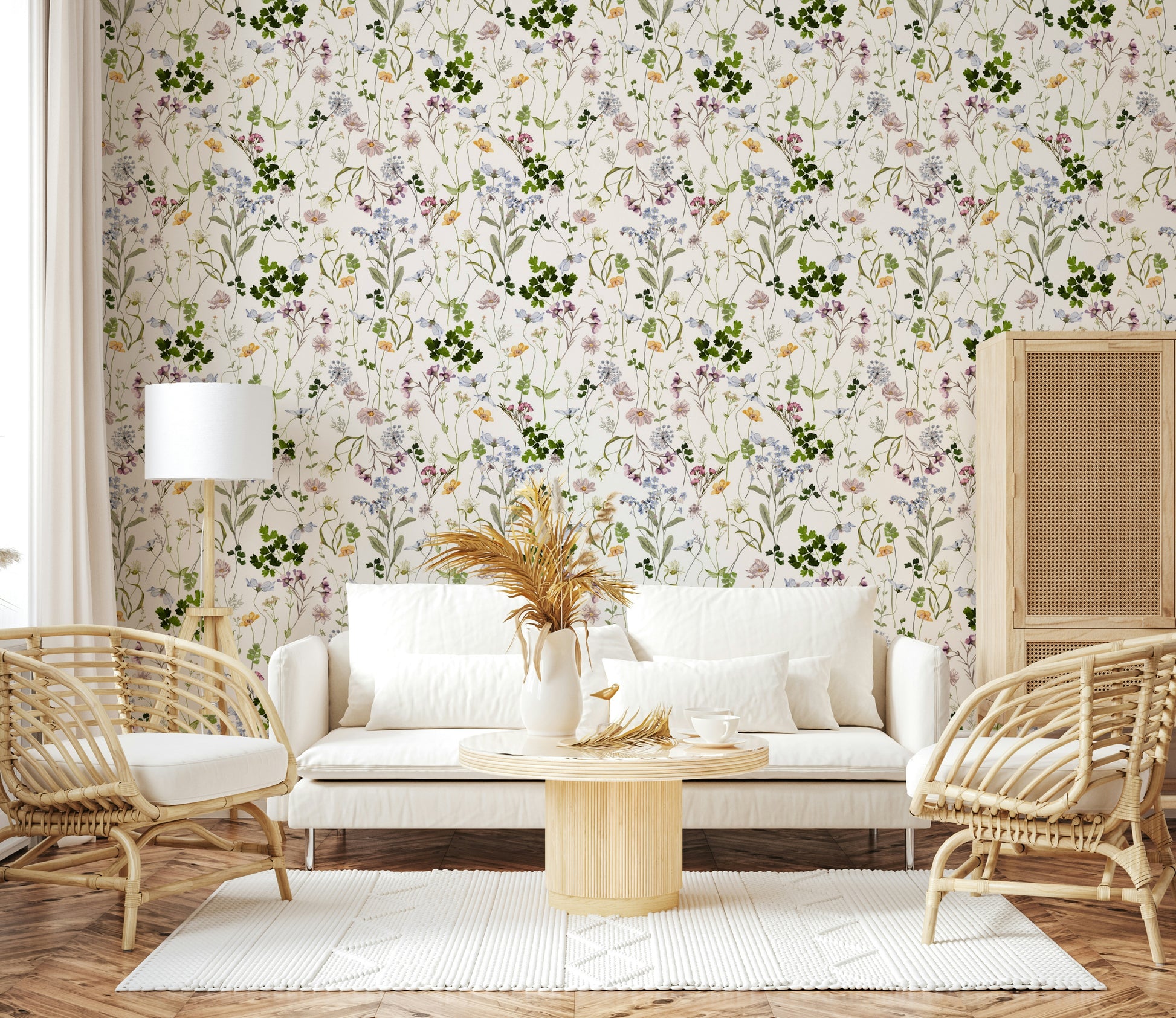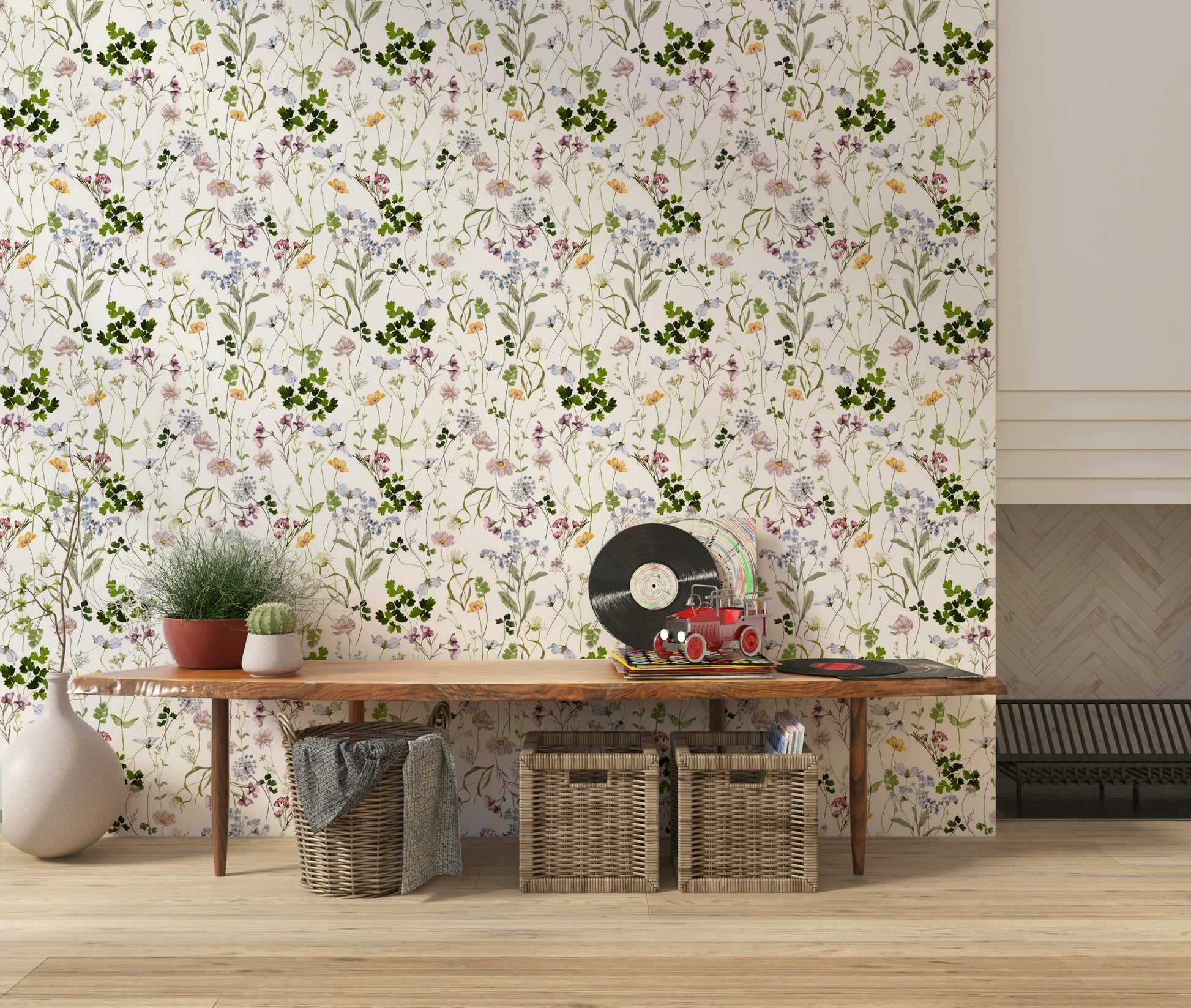 Transform your living space with the serene beauty of this wildflower meadow wallpaper for walls by Uta Naumann. Delicate watercolor blossoms in hues of blues, yellows, pinks, and purples dance across a clean white background, creating a calm and inviting atmosphere. The hand-painted style brings a touch of nature indoors, perfect for bedrooms, living rooms, or hallways. Let this pattern instill a sense of tranquility and subtle elegance, harmonizing effortlessly with a range of interior design styles from classic to modern. This design enhances natural light and brings a refreshing look to your rooms.