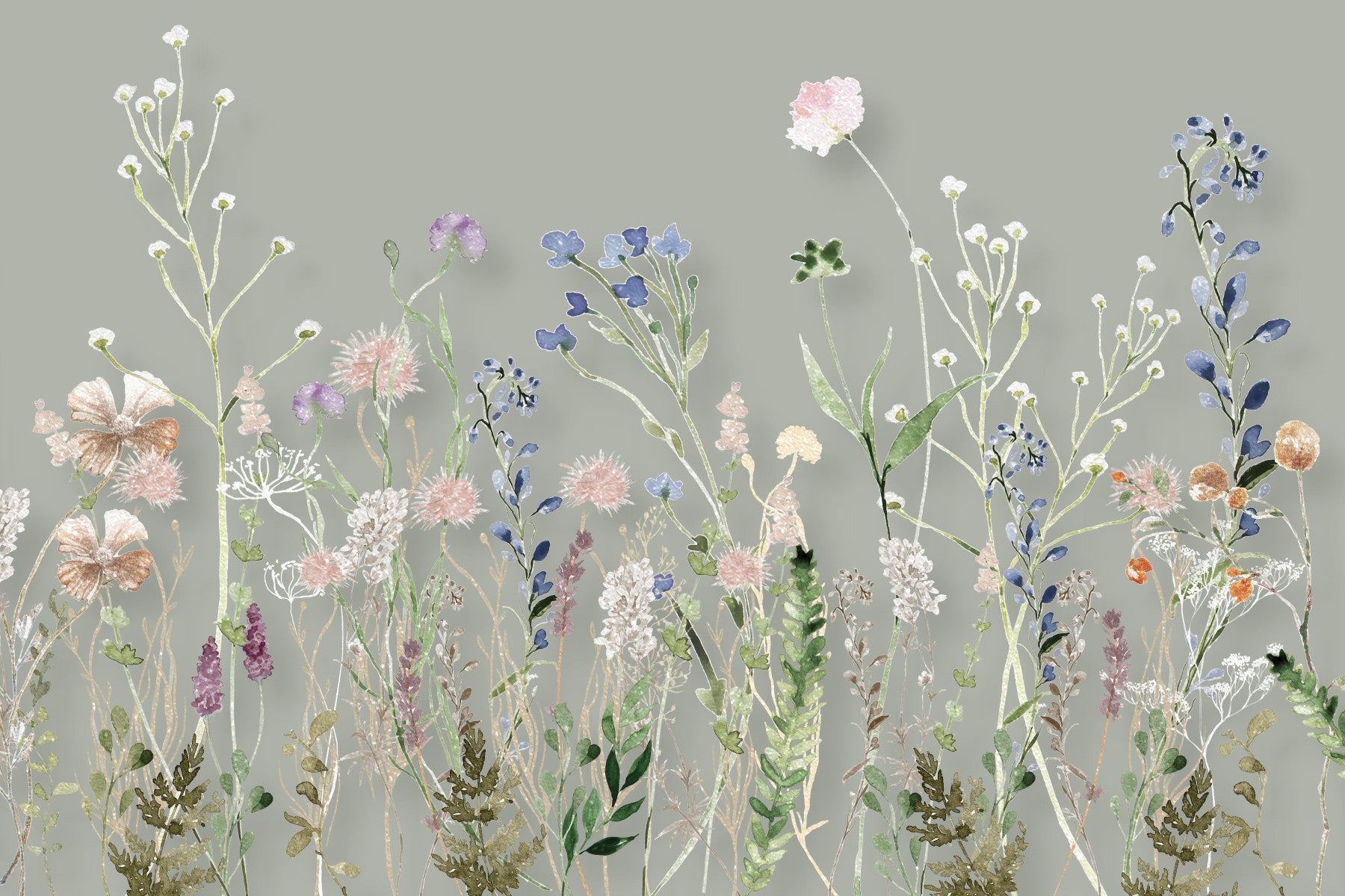 Experience the charm of a wildflower symphony with this delightful botanical design. Subtle pastel hues blend with delicate watercolor details, crafting a serene and graceful effect. Use this wallpaper for walls to effortlessly transform your space. Imagine it infusing a calm atmosphere into your bedroom. This design works beautifully in bathrooms, nurseries, or bedrooms. It effortlessly harmonizes with various interior styles, bringing a touch of gentle sophistication.
