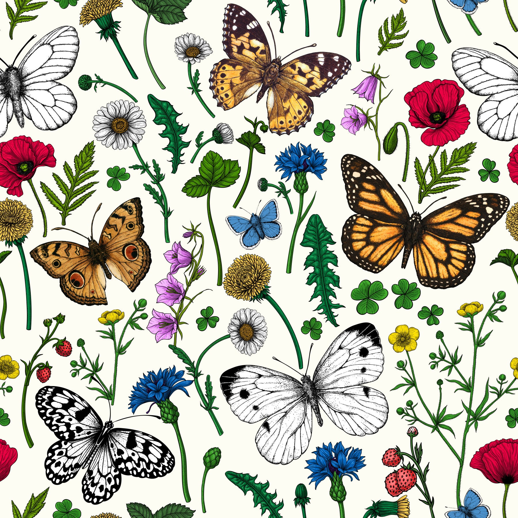A vibrant celebration of nature's beauty, this wallpaper showcases a profusion of wildflowers and butterflies in exquisite detail. Intricate botanical illustrations depict a diverse array of blooms—daisies, poppies, cornflowers, and buttercups—intertwined with delicate butterflies in a variety of colors and patterns. The creamy off-white background enhances the vividness of the flowers and the butterflies' wings, creating a tranquil yet captivating scene that evokes the serenity of a sun-drenched meadow. Perfect for bringing a touch of whimsical elegance to any digital device.