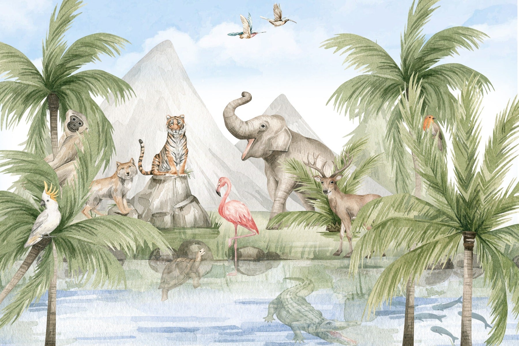 Step off the beaten path and into the heart of nature with the Wildlife Wonders Wallpaper Mural. A lavish celebration of the animal kingdom, this exquisite mural captures the untamed beauty of a jungle's inhabitants in their natural habitat. Picture the regal tiger, the wise elephant, and a flamboyance of flamingos coming to life on your walls, bringing the vibrancy of the wild indoors. This African jungle wallpaper is a symphony of nature’s splendor, meticulously crafted to showcase each creature in vivid detail. Imagine the intrigue and delight as your walls become a canvas for this rich, storytelling panorama. It's more than just animal wallpaper it's a gateway to adventure, a visual journey that beckons you to a world teeming with life and color. Embrace the call of the wild with this enchanting mural, where every glance is a new discovery, and every room is a safari waiting to be explored.