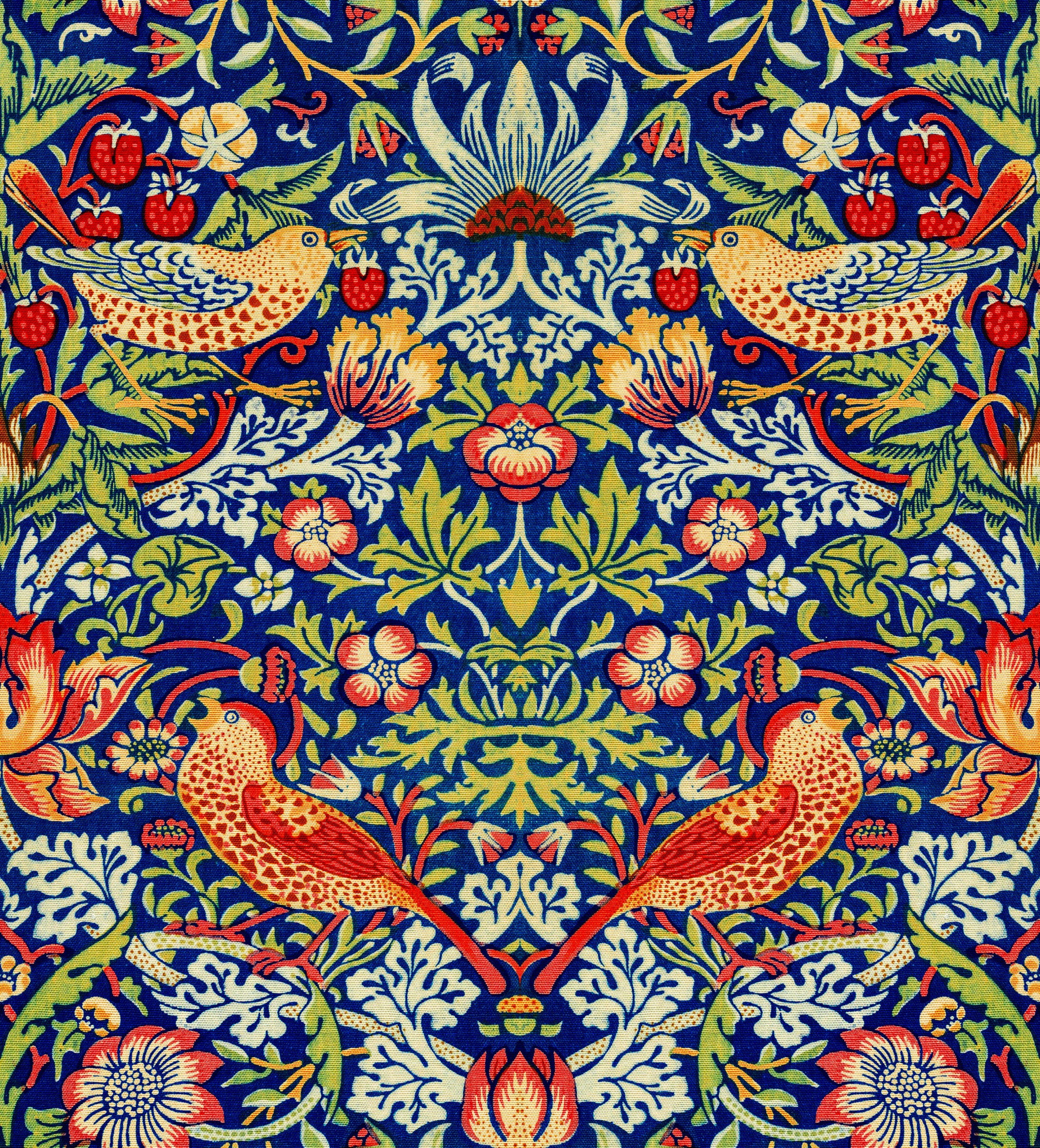William Morris's Strawberry Thief is one of his most popular textile designs, created in 1883. The design features an intricate pattern of thrushes stealing strawberries, inspired by Morris's observations in his garden at Kelmscott Manor. The artwork exemplifies the Romanticism movement and showcases a rich interplay of colors, making it a celebrated piece in the Arts and Crafts Movement. Today, it is housed in various collections, including the Victoria and Albert Museum.