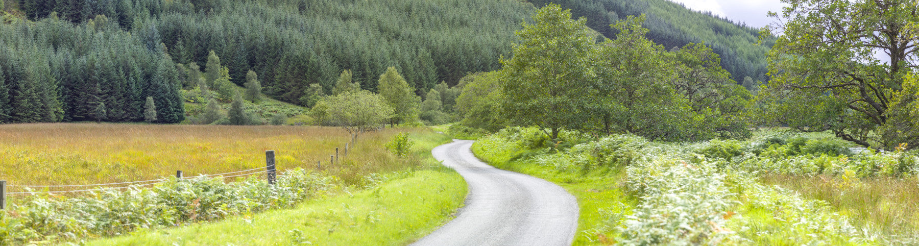Scenic road winding through trees on Winding Way Serenity Wall Mural.