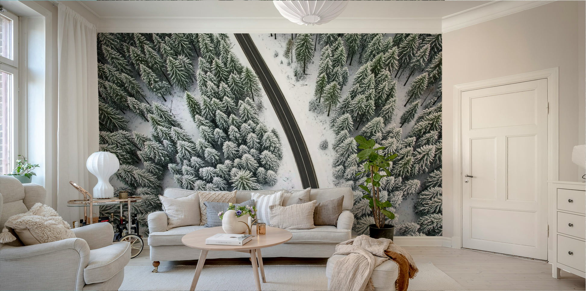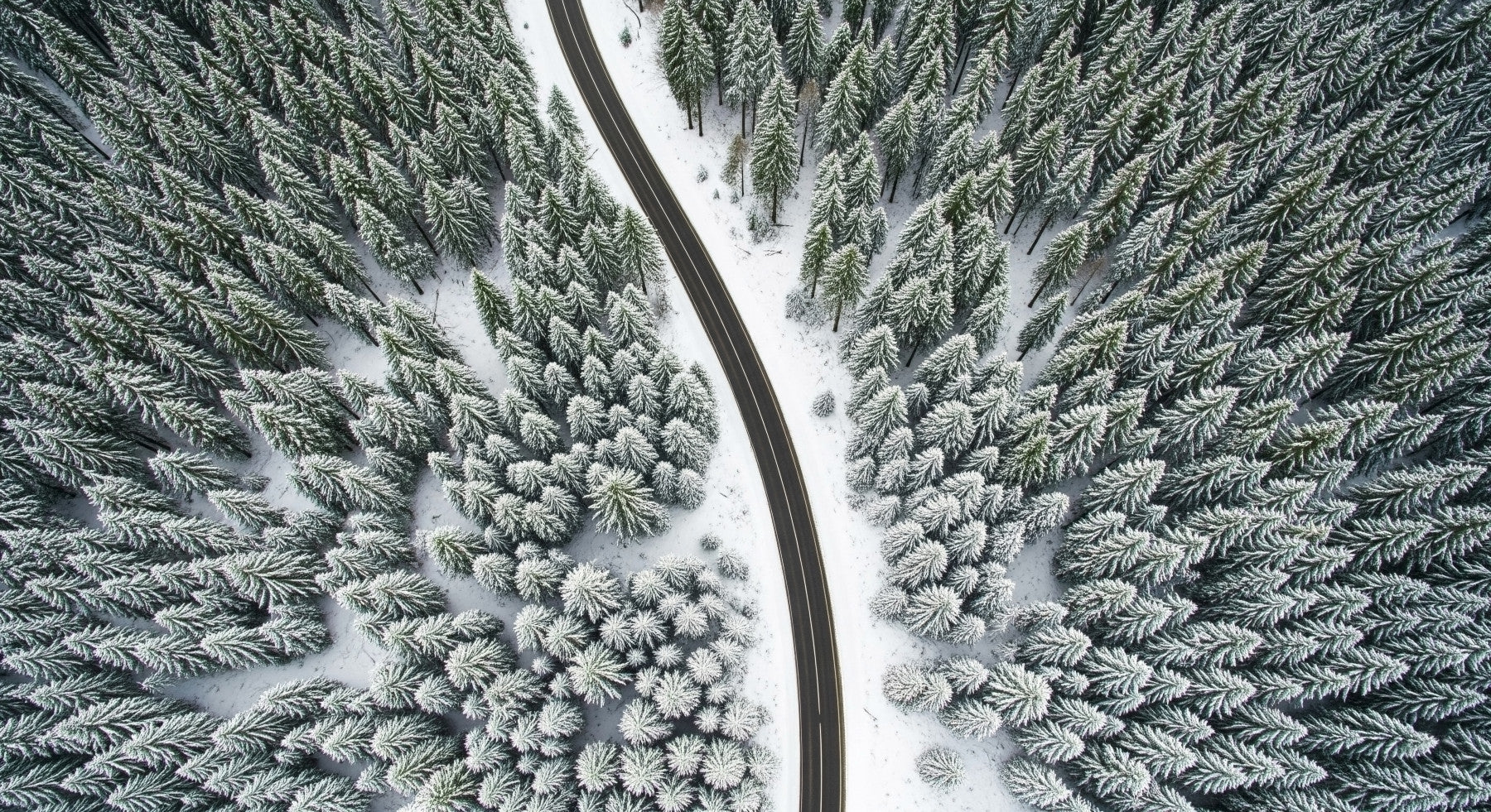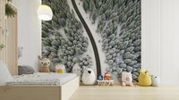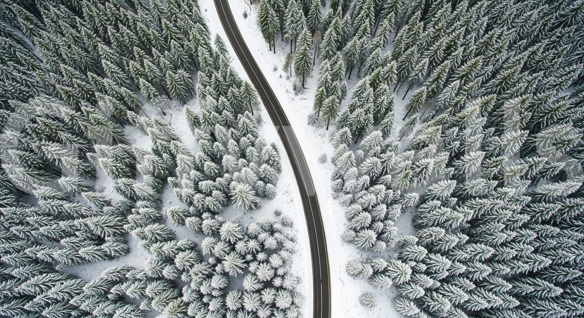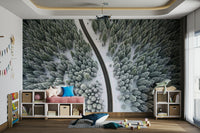 This scenic aerial view presents a crisp winter landscape. A winding road cuts through a dense forest covered in fresh snow. The contrasting colors of dark asphalt and pristine white create a compelling visual. Consider this design as wallpaper for walls to bring nature's calm into your home. It enhances living spaces and bedrooms, lending a serene and sophisticated mood. The graphic nature blends seamlessly with modern and minimalist interiors.