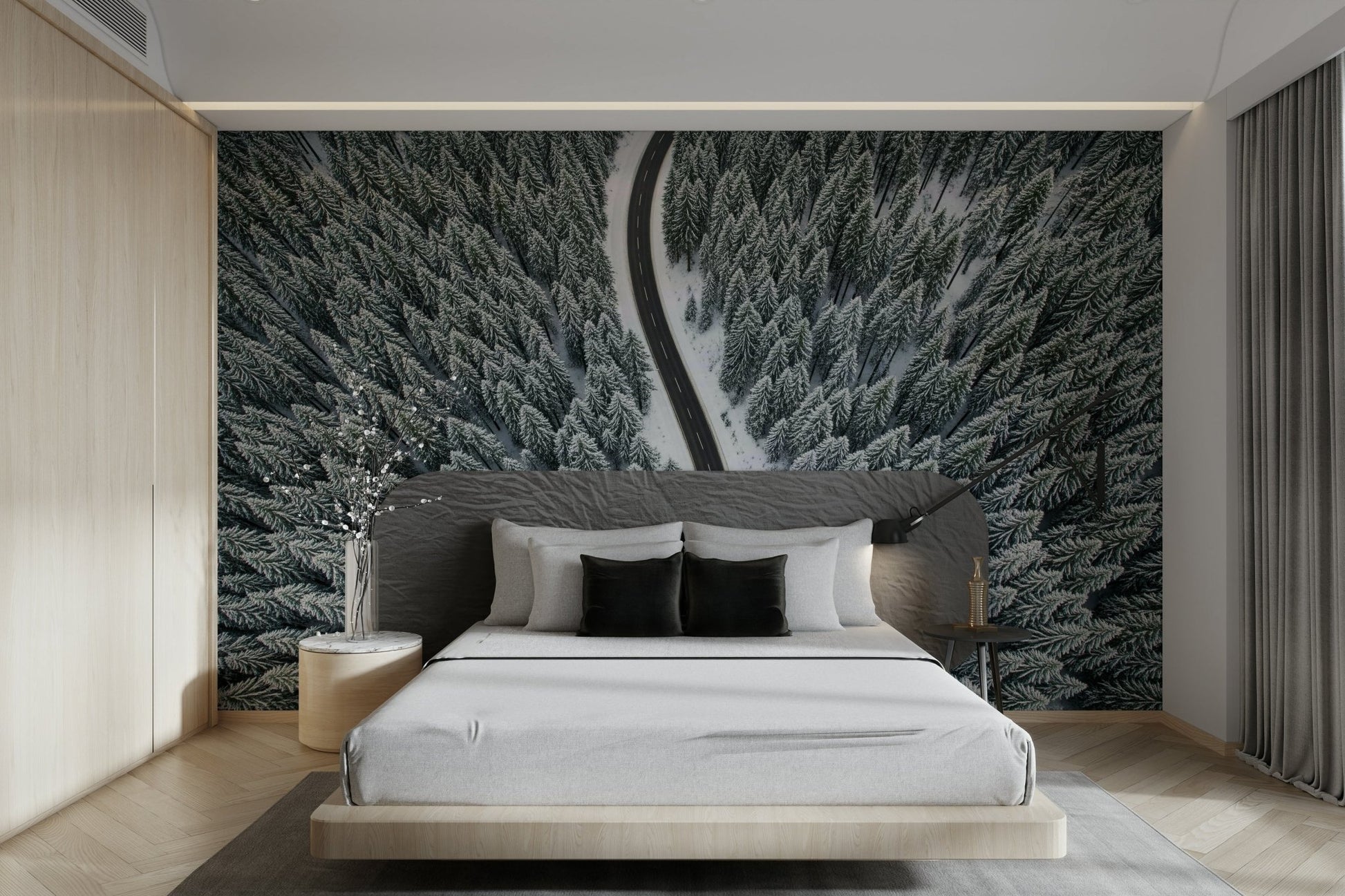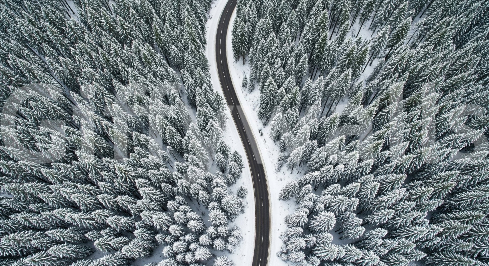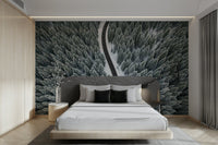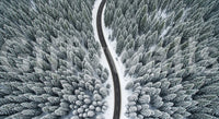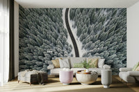 This landscape scene shows a long road cutting through a snow-covered forest. The aerial perspective highlights the textures of the trees and the stark contrast between the black asphalt and the white snow. Consider wallpaper for walls like this for an office to create a sense of focus and journey, or for a living room to bring the outdoors in. The monochromatic palette complements a minimalist design scheme.