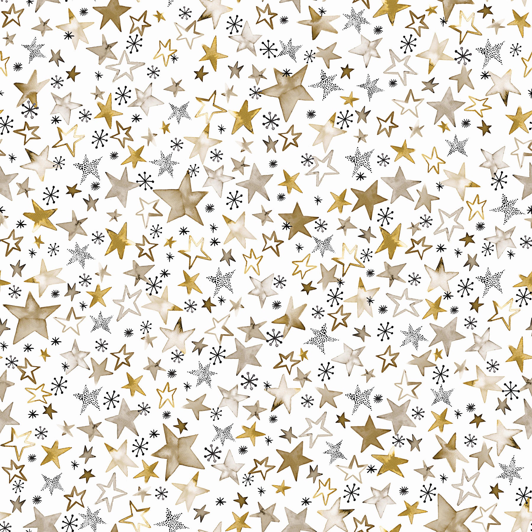 Embrace the magic of winter with this enchanting wallpaper! A celestial scattering of gold and taupe stars, in various hand-painted styles, dances across a crisp white background. Delicate black snowflakes add a touch of winter's chill, creating a playful yet sophisticated design. Perfect for children's rooms or anyone who appreciates a touch of whimsical elegance. The warm gold tones bring a cozy festive feel, ideal for the holiday season or year-round wintery charm. This wallpaper radiates a joyful and sparkling atmosphere, bringing a touch of celestial wonder to any digital device.