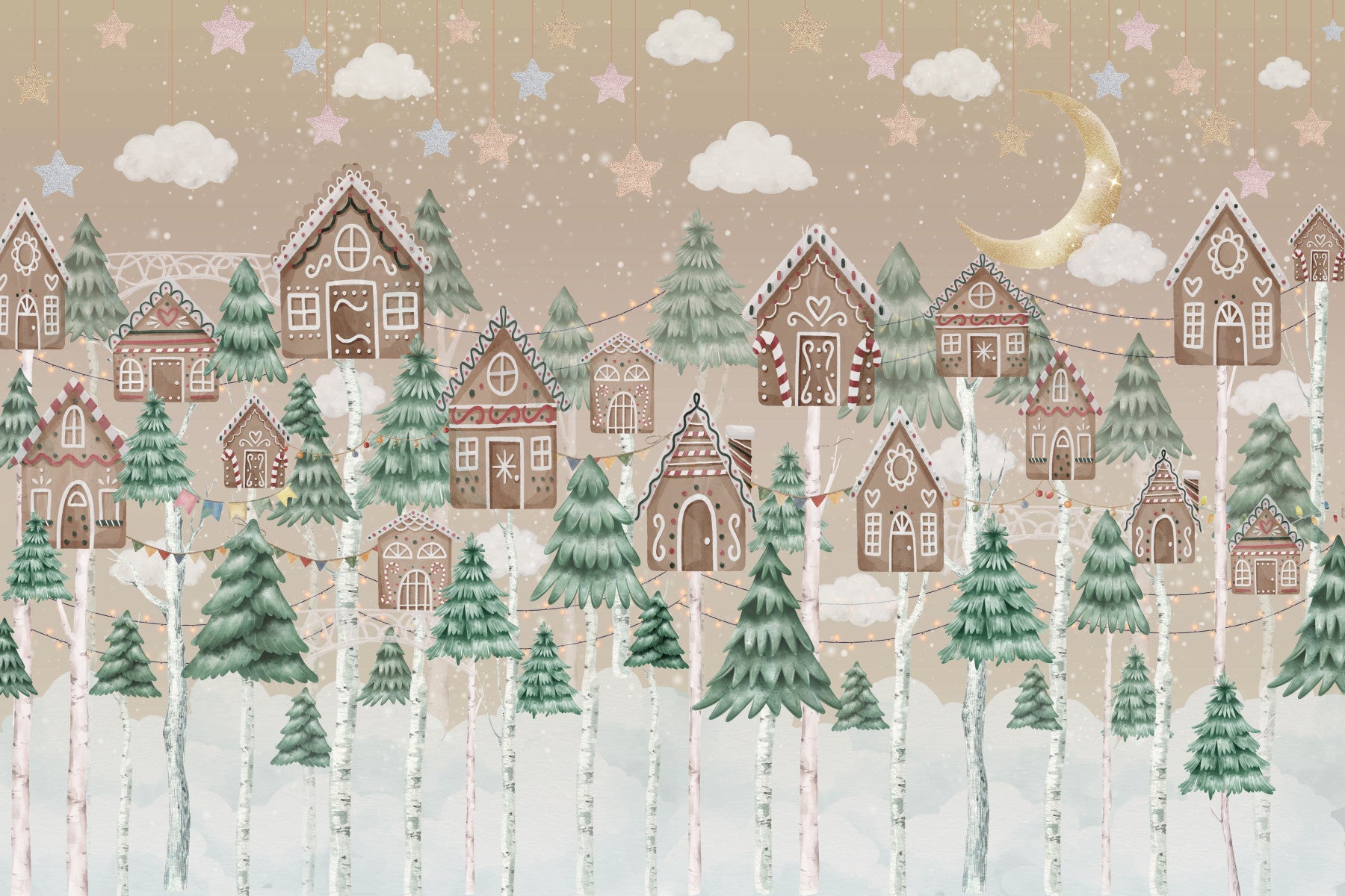 Transform your room with this enchanting design! Adorable gingerbread houses peek through a forest of Christmas trees under a starry night sky, all rendered in a soft, comforting palette. This charming wallpaper for walls brings a festive, storybook feel to any room. It's perfect for creating a cozy reading nook or a magical kids room. Let this delightful scene complement your interior décor with sweetness and light.