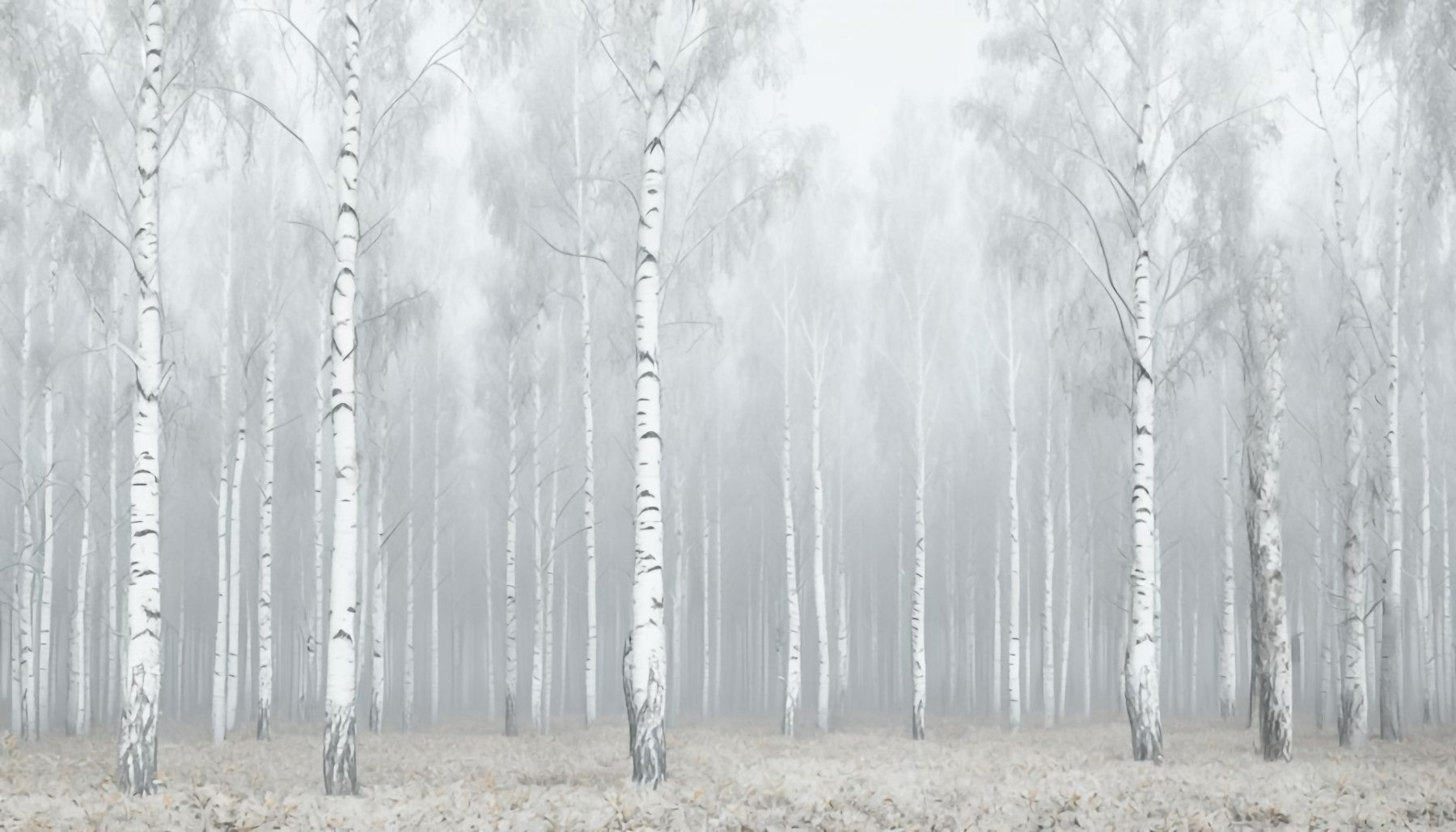 Invite the quiet beauty of a winter forest into your home. This image shows birch trees in a foggy woodland scene. The pale gray tones create a sense of calm. Use this wallpaper for walls to create a cozy space. It is perfect for a bedroom or living room. The nature-inspired art complements minimalist and modern designs. It brings the outside in and makes interiors feel spacious and airy.
