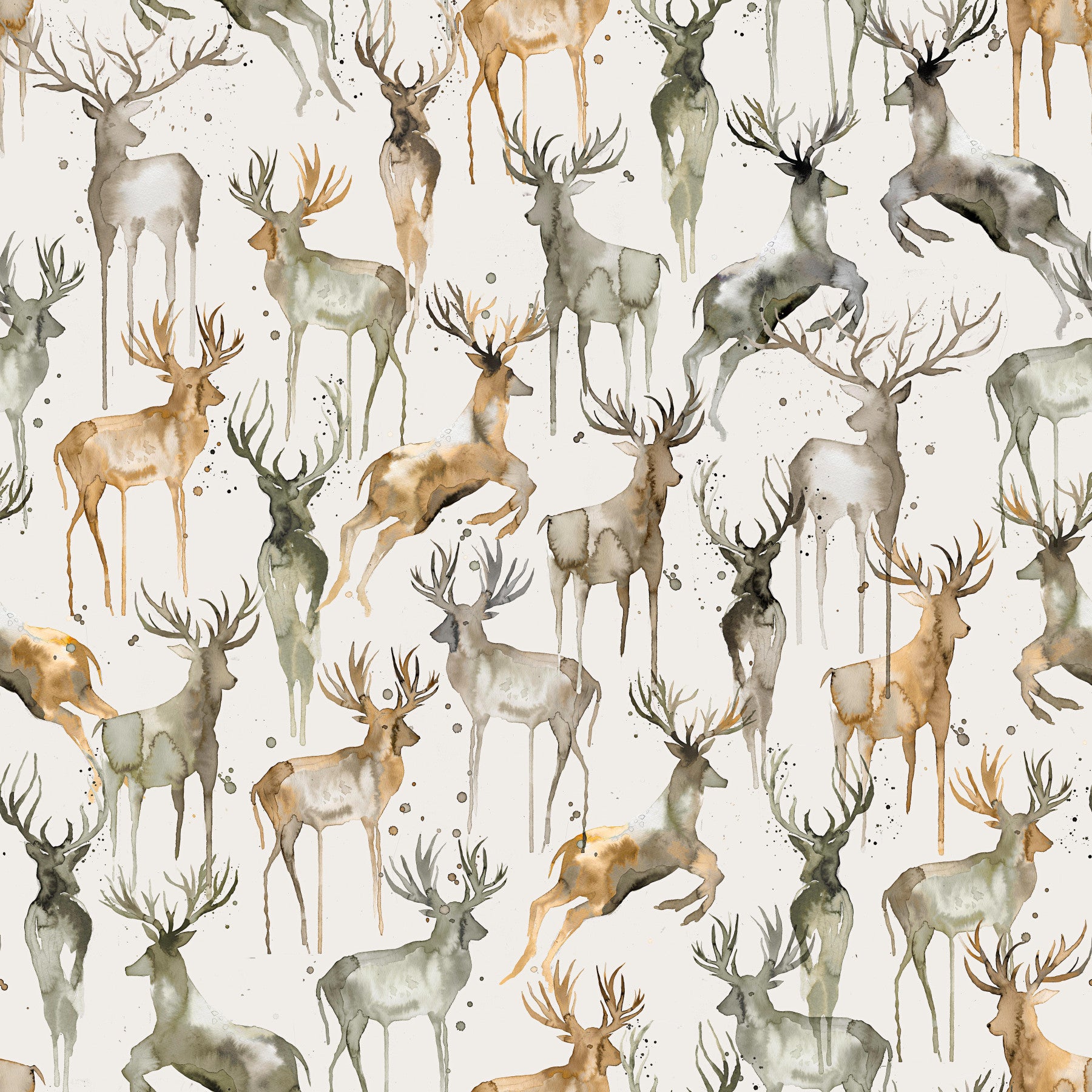 Embrace the serene beauty of winter with this artistic wallpaper. Elegant watercolor deer in shades of beige, brown, and grey grace a soft, off-white background. Their stylized forms, captured with delicate brushstrokes, evoke a sense of calm and wintery wonder. Subtle watercolor splatters add a touch of organic texture, completing the sophisticated and subtly rustic design. This wallpaper is perfect for creating a peaceful and stylish atmosphere in any room, bringing the tranquility of a winter forest indoors. The muted color palette ensures a calming and versatile aesthetic, suitable for a range of interior design styles.