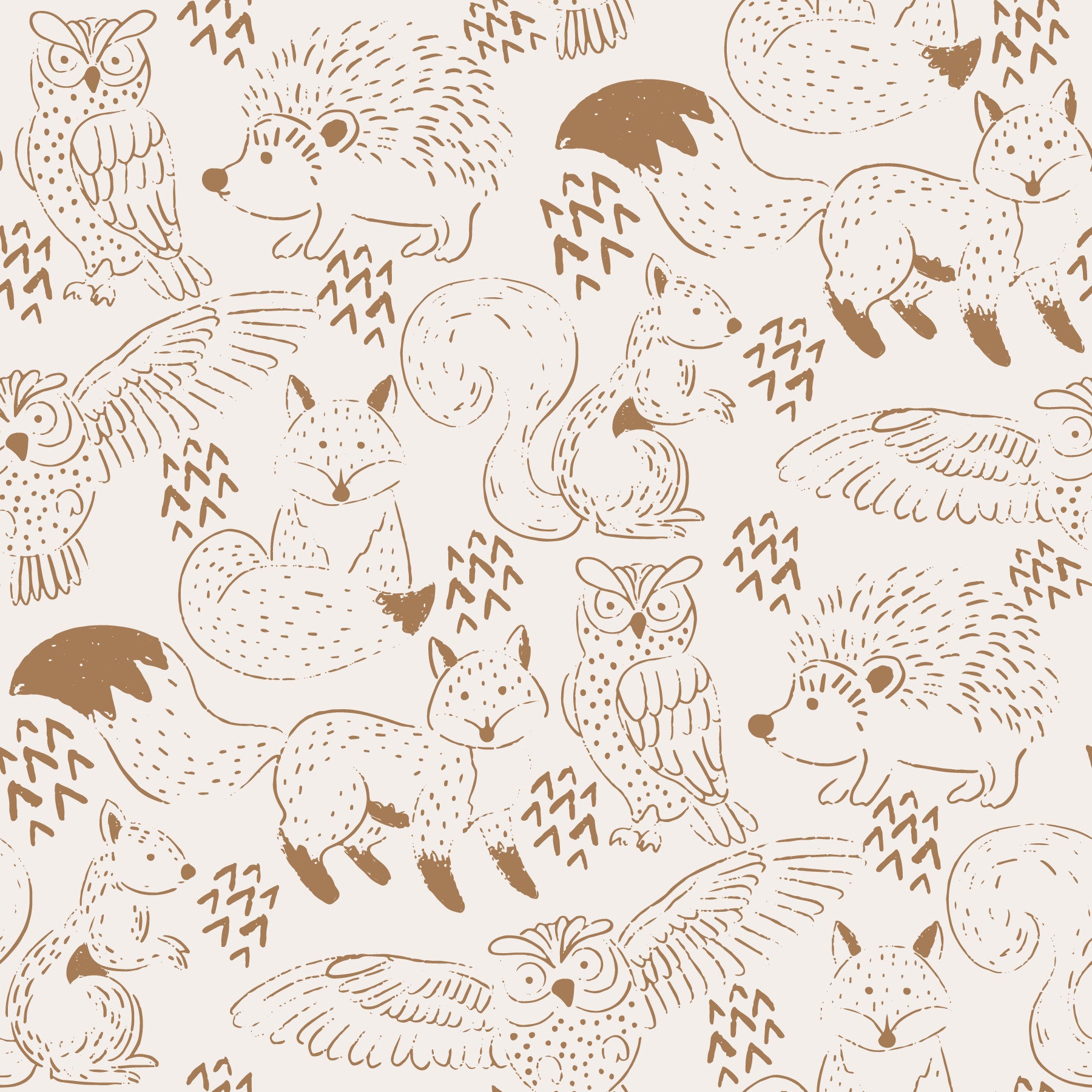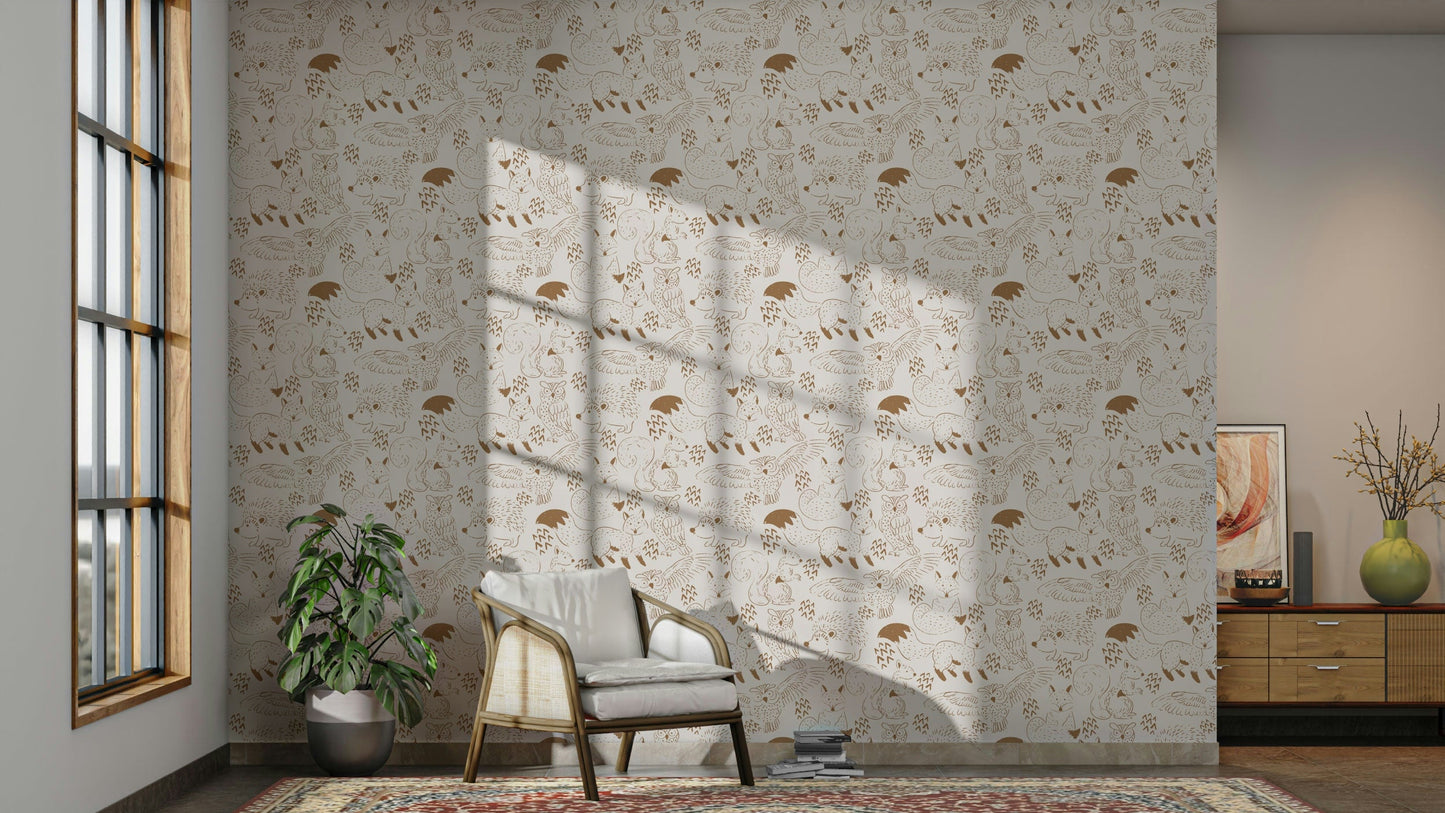 Woodland Animal Neutral Brown Wallpaper showcases charming hand-drawn illustrations of foxes, owls, squirrels, and hedgehogs in soft neutral brown tones. This mural wallpaper is ideal wallpaper for walls in nurseries, bedrooms, or cozy living spaces seeking a warm and natural feel. The simple, sketch-style design pairs well with minimalist, rustic, or nature-inspired interiors. Crafted from durable, easy-to-install materials, this wall mural maintains its gentle colors and intricate patterns over time. Its subtle woodland theme adds comfort and playful character to any room without overpowering the space.