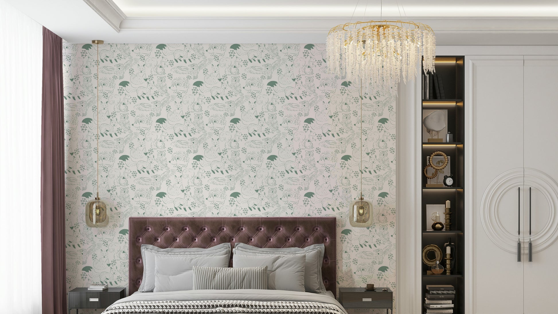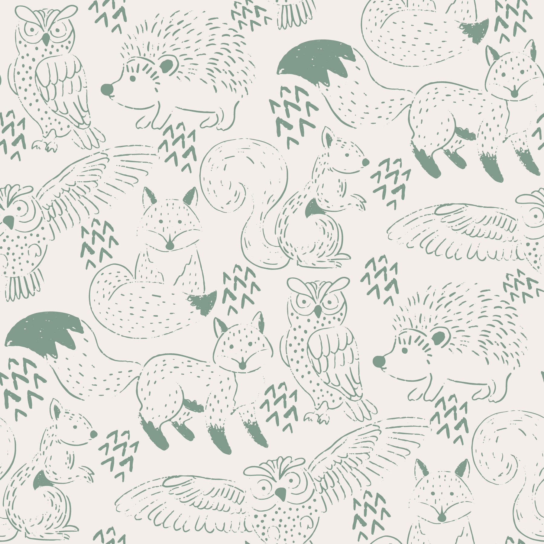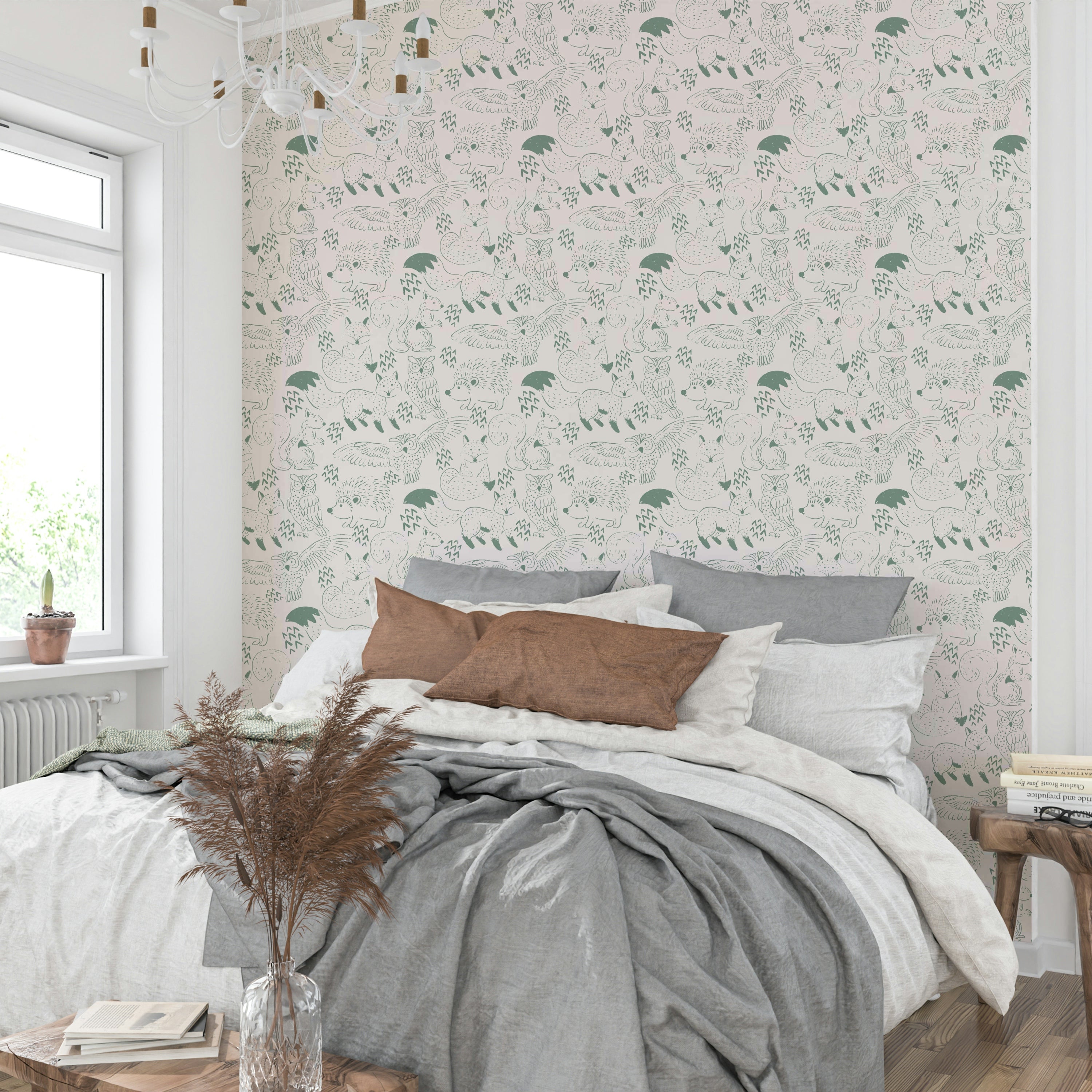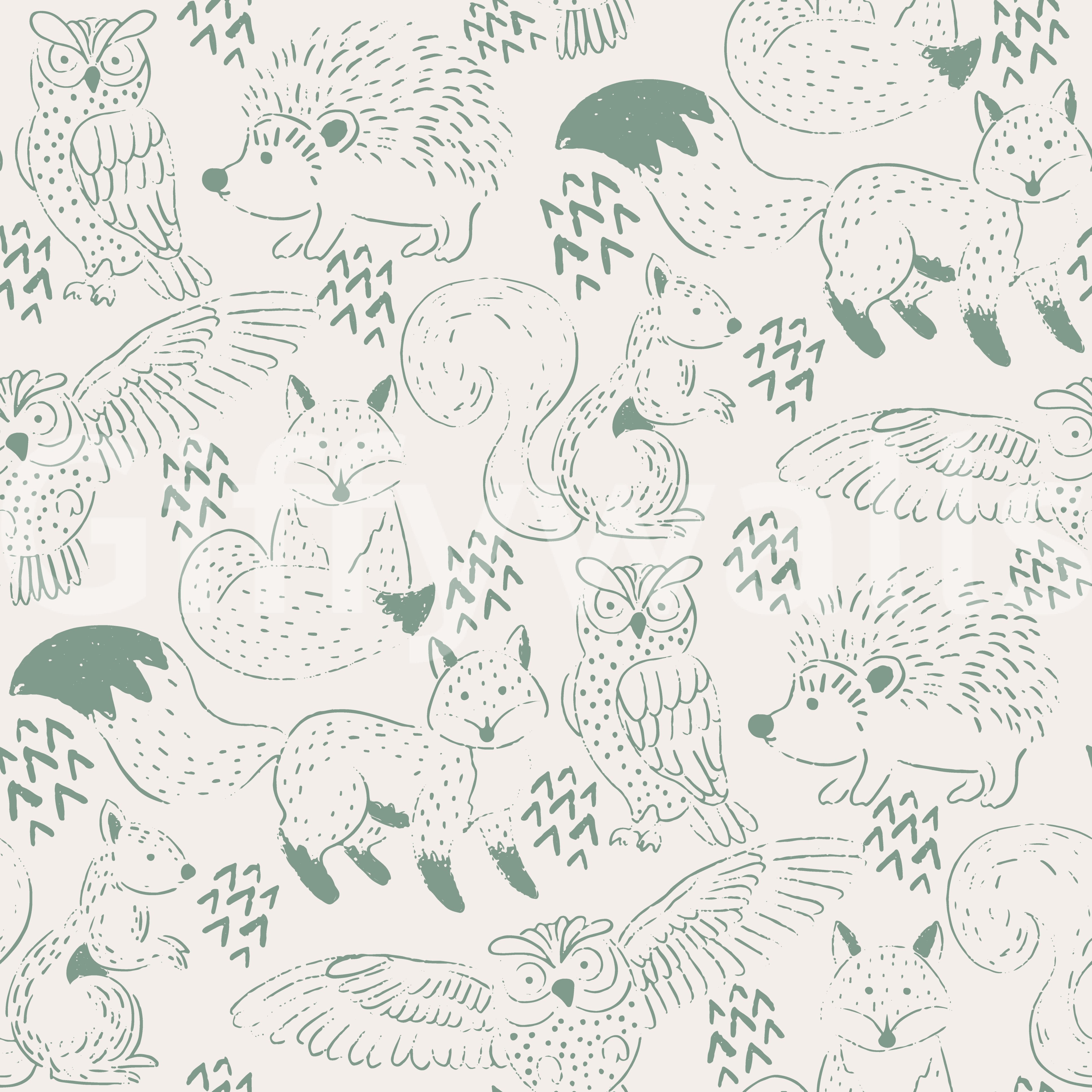 Woodland Animal Neutral Green Wallpaper features charming, hand-drawn illustrations of foxes, owls, squirrels, and hedgehogs in soft neutral green tones. This mural wallpaper is perfect wallpaper for walls in nurseries, bedrooms, or cozy living spaces where a calm, natural vibe is desired. The simple, sketch-like design blends well with minimalist, Scandinavian, or nature-inspired interiors. Made from durable, easy-to-install materials, this wall mural maintains its gentle colors and pattern over time. Its understated woodland theme adds warmth and a playful touch to any room without overwhelming the decor.
