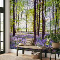 Immerse yourself in a peaceful woodland scene with this captivating wallpaper. Vibrant purple flowers stretch across the forest floor, contrasting beautifully with the green leaves and tall trees. Light shines through the trees, adding a warm glow. This wallpaper for walls makes a statement in any room. It enhances bedrooms, living rooms, or hallways. It complements rustic, farmhouse, and modern styles, bringing a touch of nature inside.