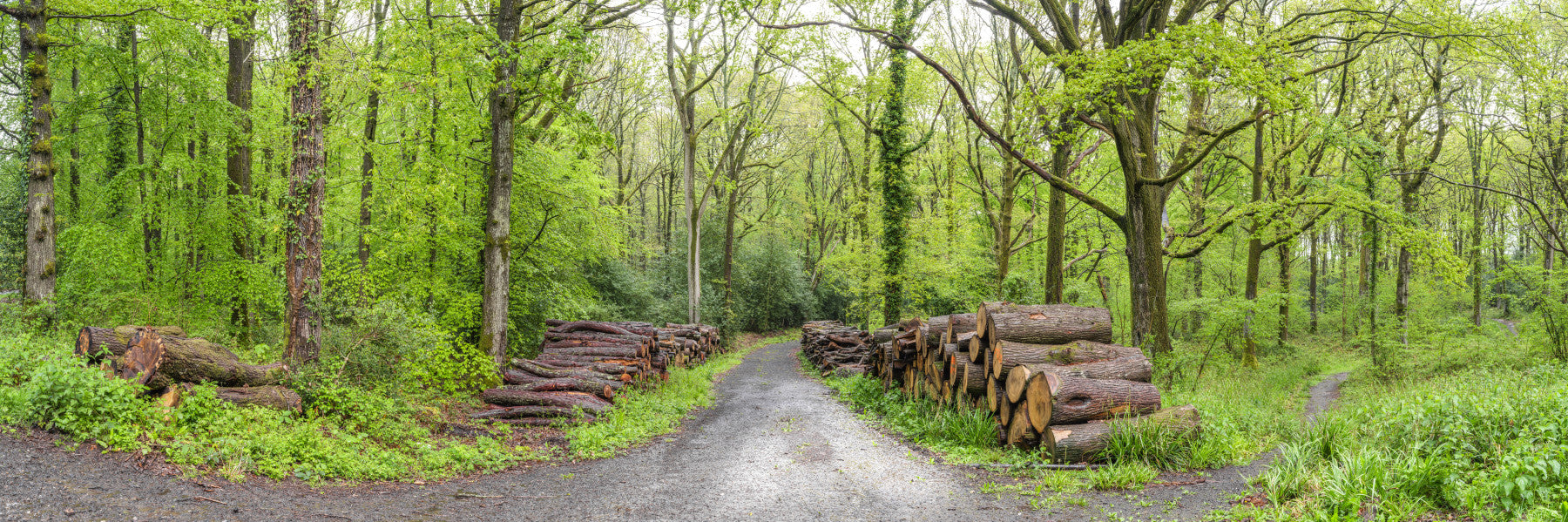 The Woodland Harmony Wall Mural features a vibrant, green forest scene with a dirt path lined by stacks of cut logs. The lush spring foliage and tall tree trunks create a refreshing, natural atmosphere, perfect for making a room feel expansive. This panoramic mural wallpaper provides a realistic, restful view of nature's renewal. Simple to install, this high-quality wallpaper for walls offers a durable and impressive focal point. Use this exceptional wall mural to introduce the fresh, invigorating energy of a sun-dappled forest into your home or office space.