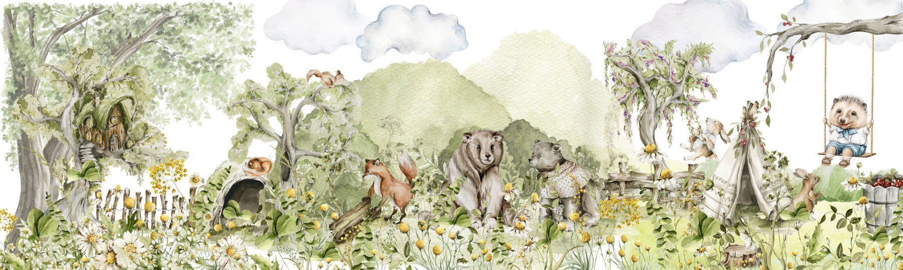 Invite nature's charm indoors with this watercolor woodland scene by Uta Naumann. Gentle greens and yellows create a peaceful landscape filled with adorable animals. This design features a treehouse, bears, a fox, and a swinging hedgehog, ideal for creating a cozy atmosphere. The soft color palette and whimsical style make it a perfect wallpaper for walls in a nursery, kids' room, or playroom. Let this delightful pattern enhance your interiors with its playful and inviting aesthetic.