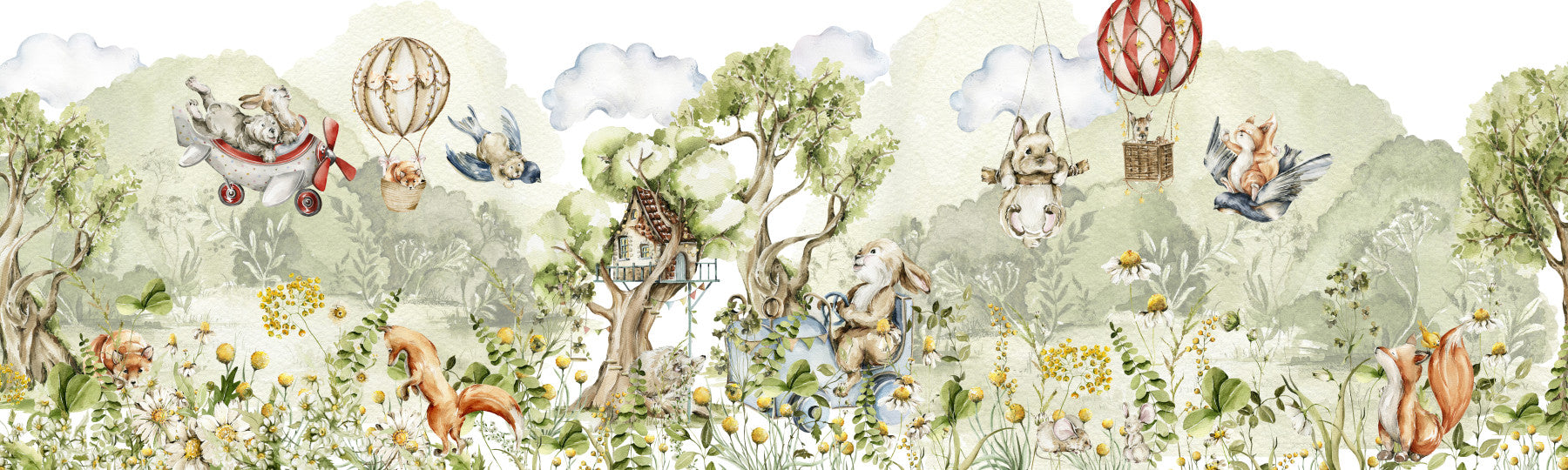 Step into a charming world with this delightful wallpaper for walls by Uta Naumann! Adorable animals take flight in planes and balloons, nestled among lush greenery and wildflowers. The soft, muted tones of green, brown, and blue create a soothing atmosphere. Perfect for a nursery, kids' room, or playroom. This wallpaper adds a touch of playful adventure, and the gentle color palette makes it easy to blend with a variety of interior styles.