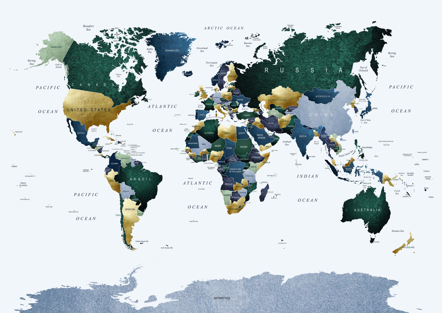 A stunning world map wallpaper in elegant green and blue hues, accented with gold detailing. The textured effect adds depth and sophistication, creating a luxurious feel. Each country is subtly highlighted, making this a sophisticated and informative piece that's perfect for adding a touch of worldly charm to any space. The color palette evokes a sense of calm and global unity, making it ideal for home offices, studies, or anywhere you desire a calming yet stylish backdrop. This high-resolution image offers crisp details and vibrant color, ensuring a captivating visual experience.
