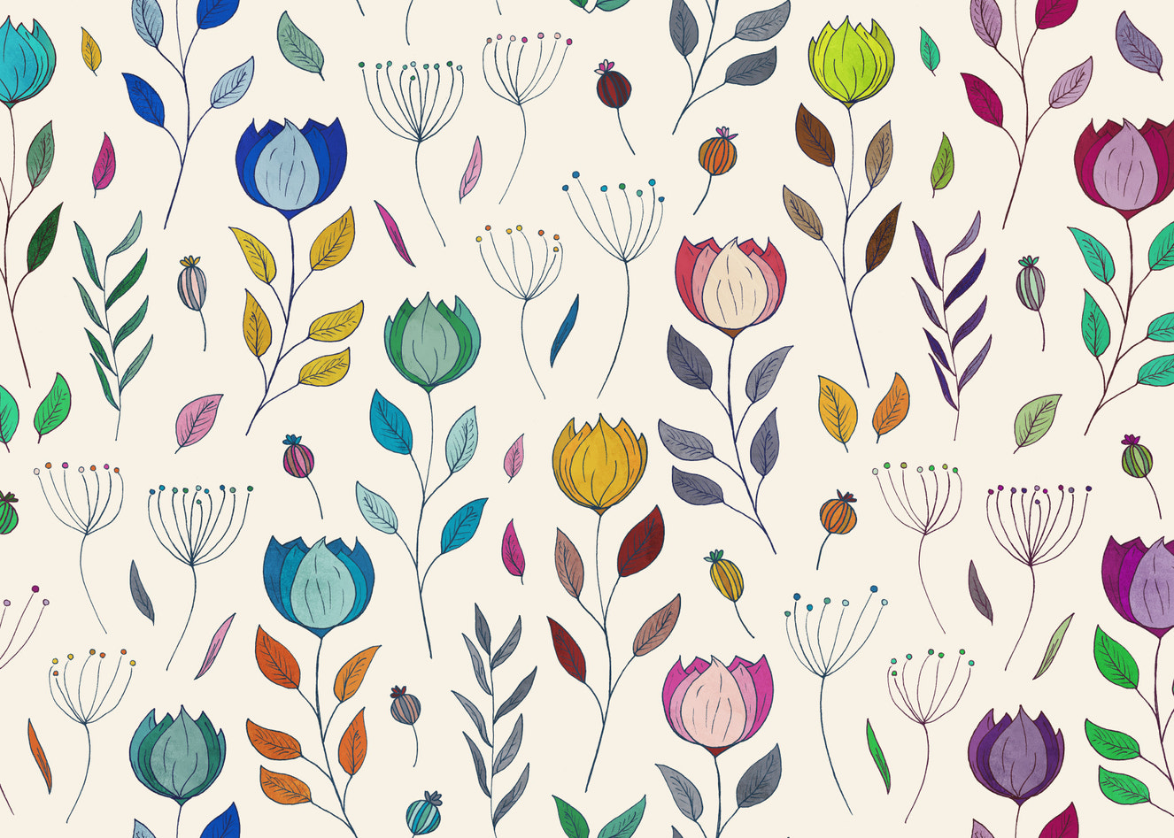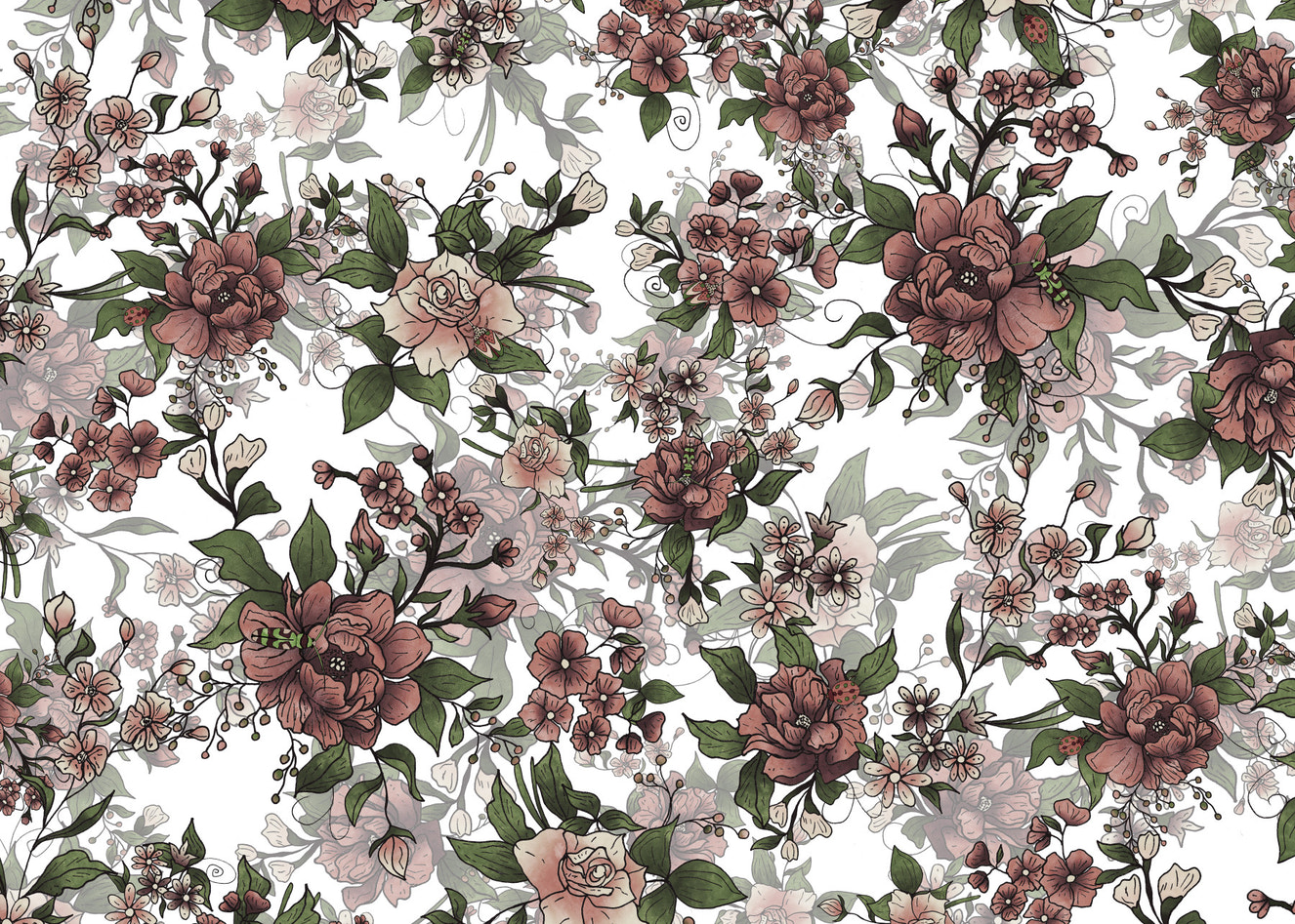Ladybug, dragonfly, and birds in a floral wallpaper.